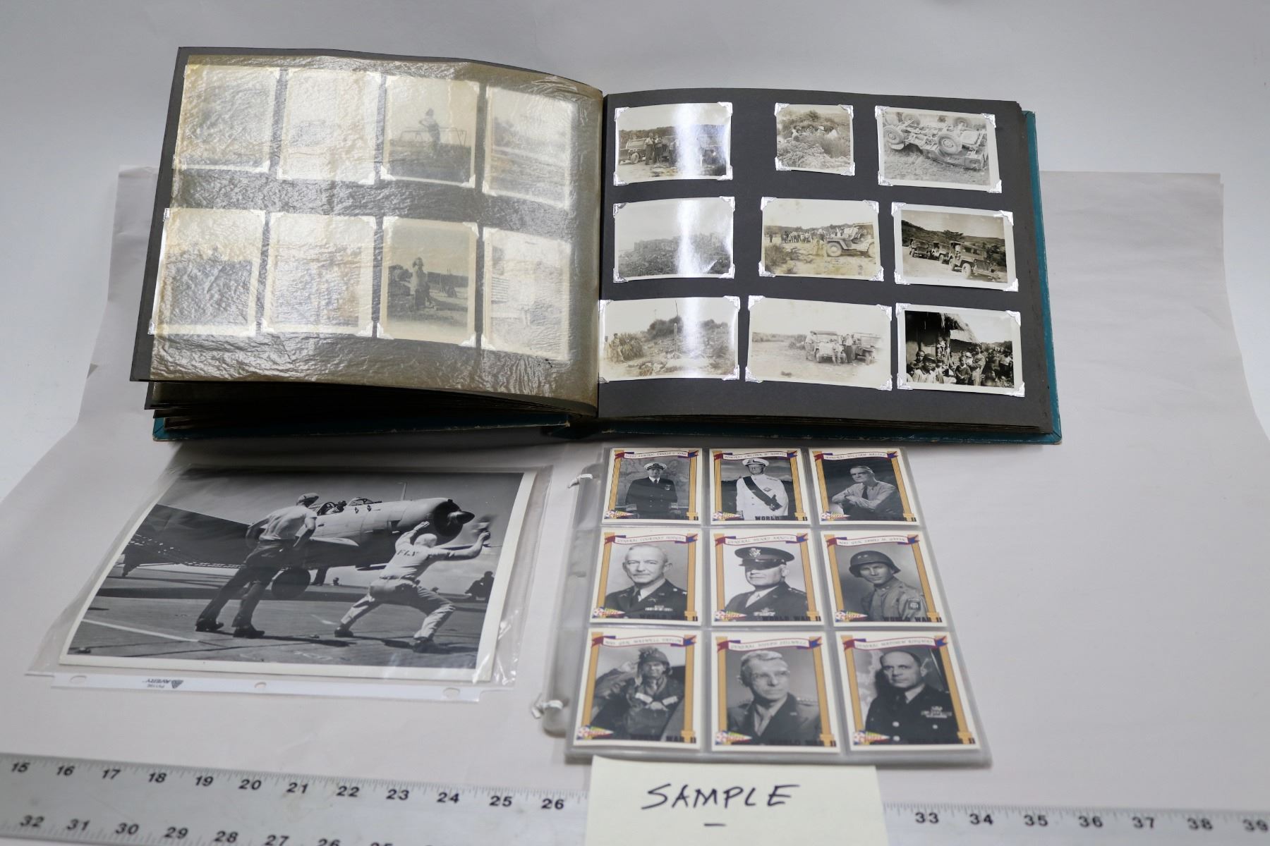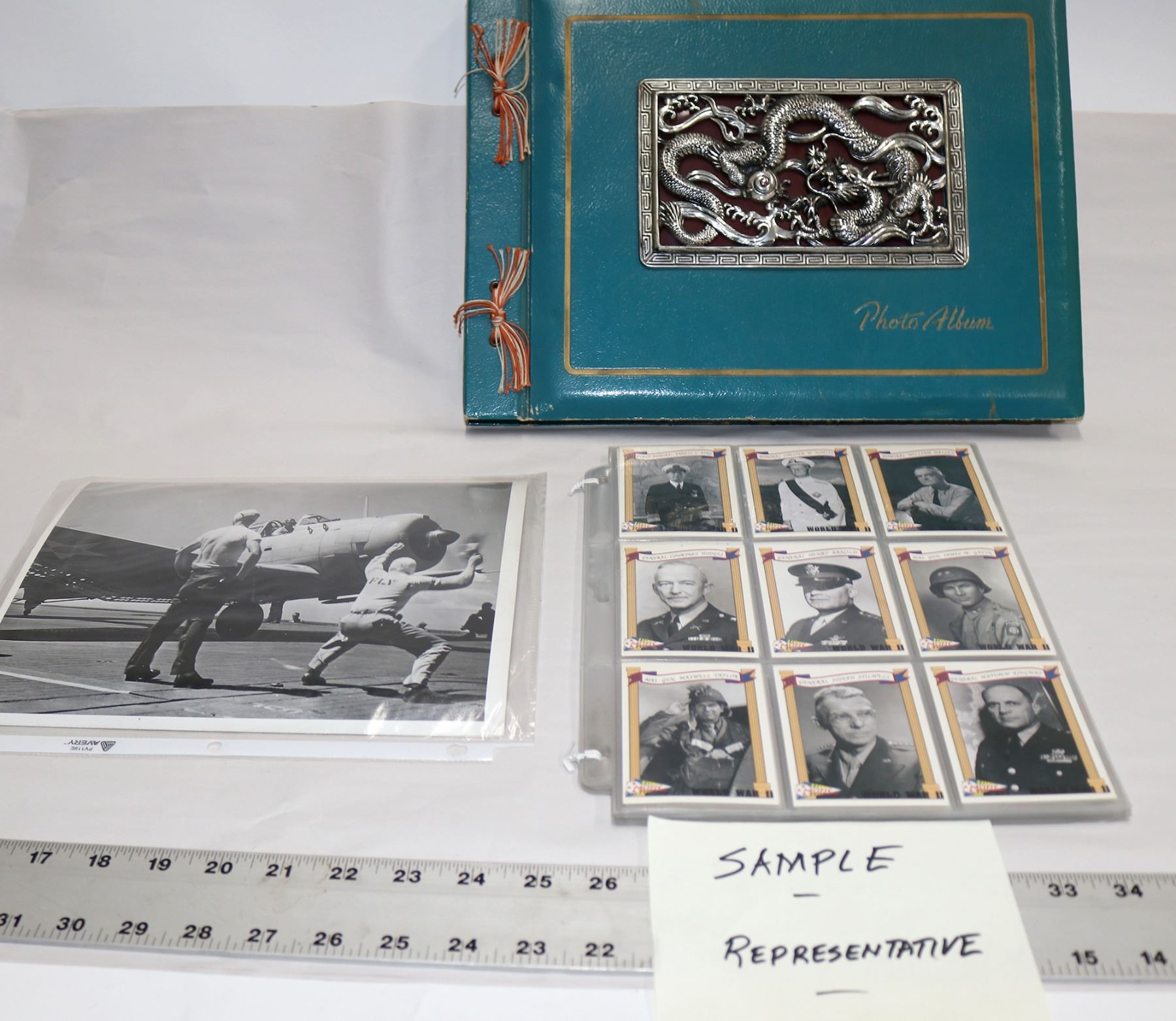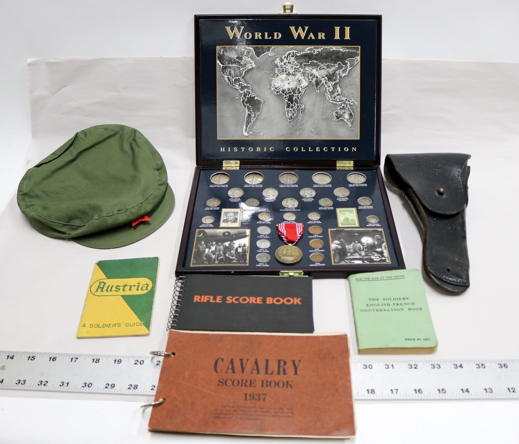 This is a collection from a naval officer during WW2. There are six official US Navy 8X10 photos involving the Battle of the Corral Sea 1942. See Japanese torpedo planes disable the USS Lexington. Another series of photos (official US Navy) shows the Japanese carrier Shokako being attacked by US planes and in torpedo avoidance maneuvers. Another photo album shows post-WW2 occupation of Japan with photos of Okinawa, about 180 photos. A collection of US coins minted from 1941 to 1946. A collection of WW2 trading cards of 80 in all with descriptions of each person including a young John F. Kennedy, 2nd Lt. Audie Murphy, Admiral Yamamoto, Col. Oveta Hobby, and Lt. General James Dolittle. There are two Soldier's Guide books; one for Austria and the other for France for conversational translations. Two record books for rifle practice. One Chinese red star cap, and one like new service revolver holster.