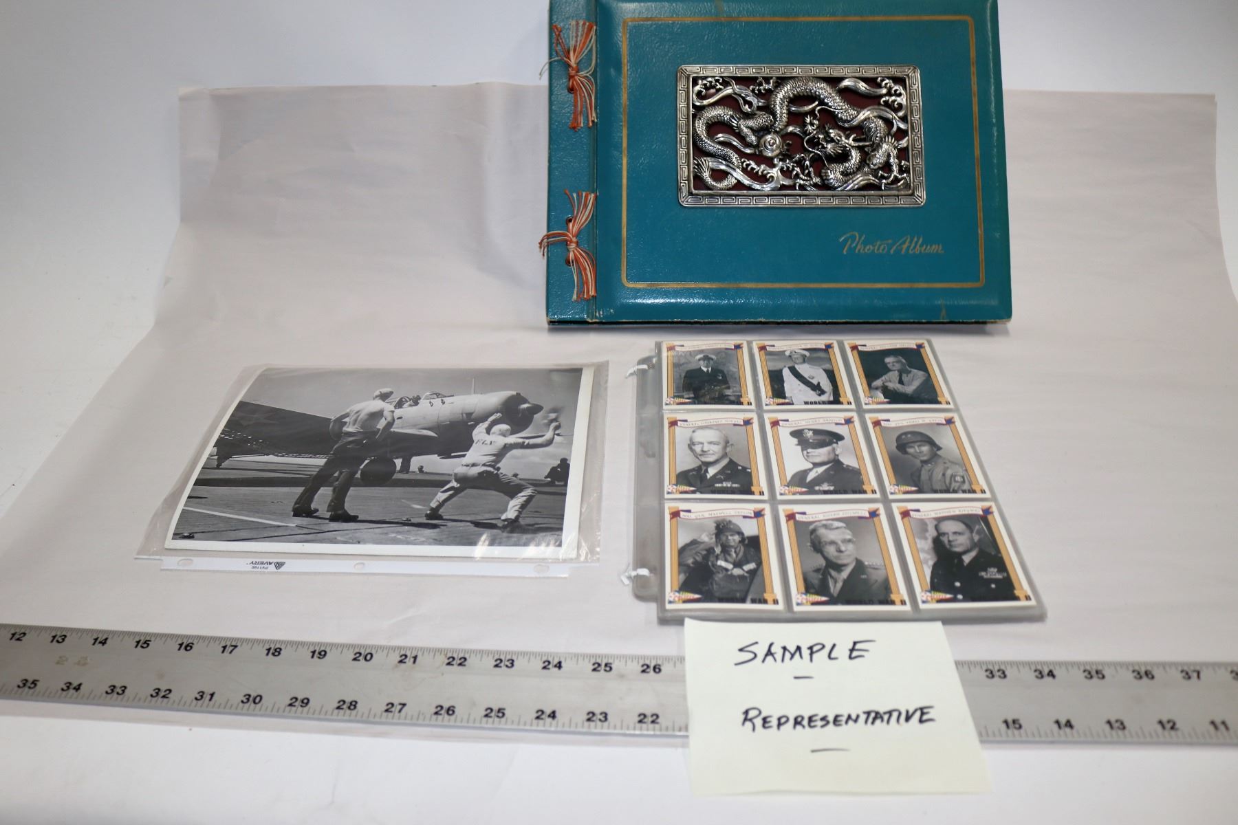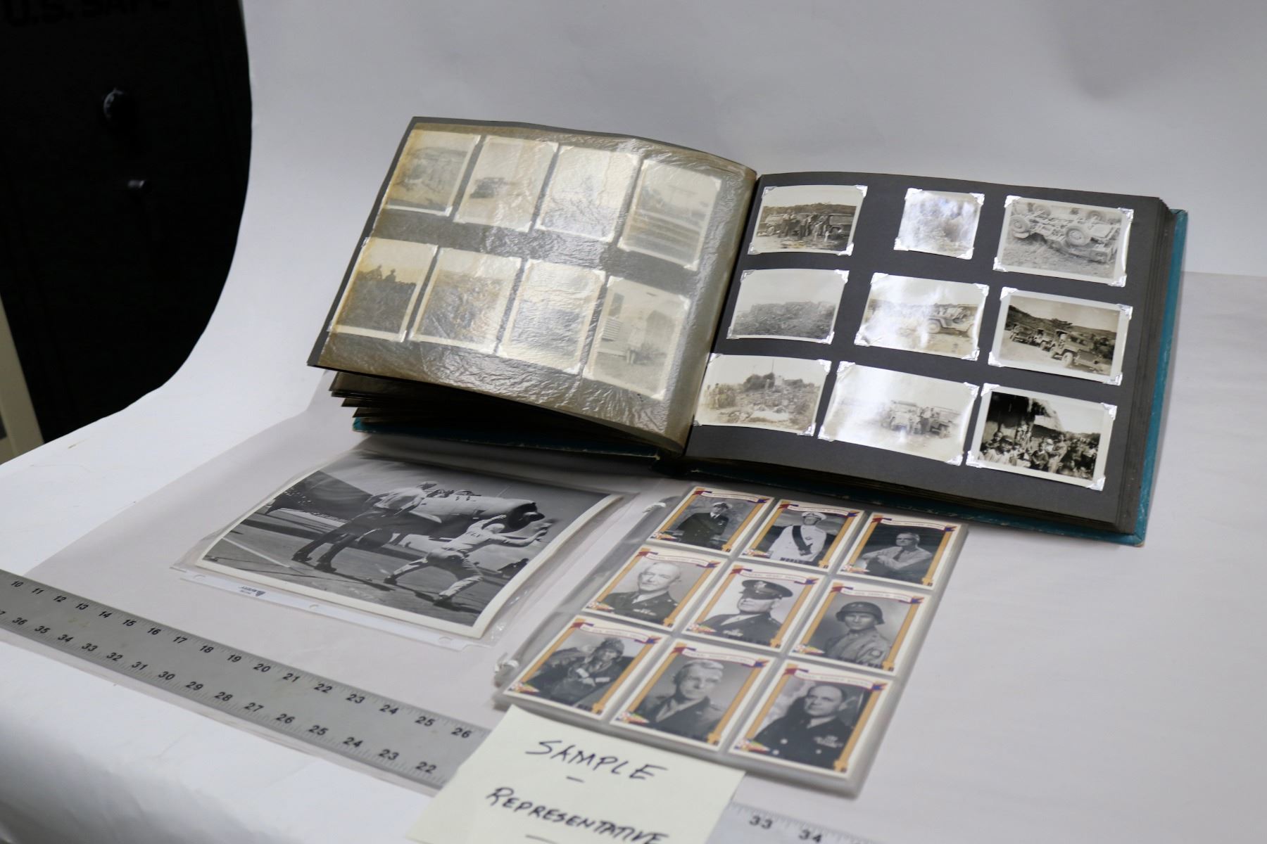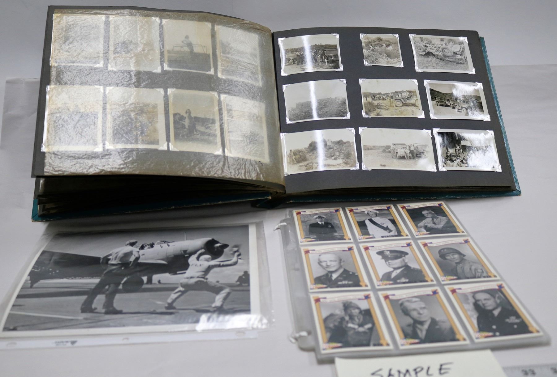 This is a collection from a naval officer during WW2. There are six official US Navy 8X10 photos involving the Battle of the Corral Sea 1942. See Japanese torpedo planes disable the USS Lexington. Another series of photos (official US Navy) shows the Japanese carrier Shokako being attacked by US planes and in torpedo avoidance maneuvers. Another photo album shows post-WW2 occupation of Japan with photos of Okinawa, about 180 photos. A collection of US coins minted from 1941 to 1946. A collection of WW2 trading cards of 80 in all with descriptions of each person including a young John F. Kennedy, 2nd Lt. Audie Murphy, Admiral Yamamoto, Col. Oveta Hobby, and Lt. General James Dolittle. There are two Soldier's Guide books; one for Austria and the other for France for conversational translations. Two record books for rifle practice. One Chinese red star cap, and one like new service revolver holster.