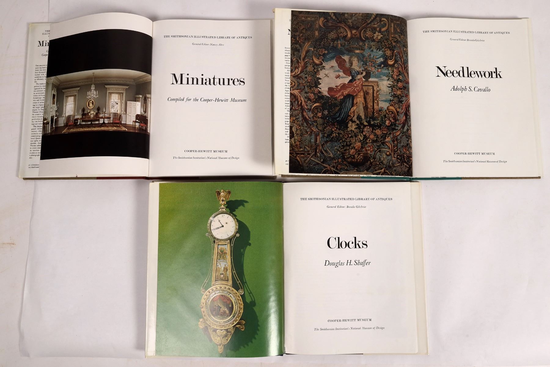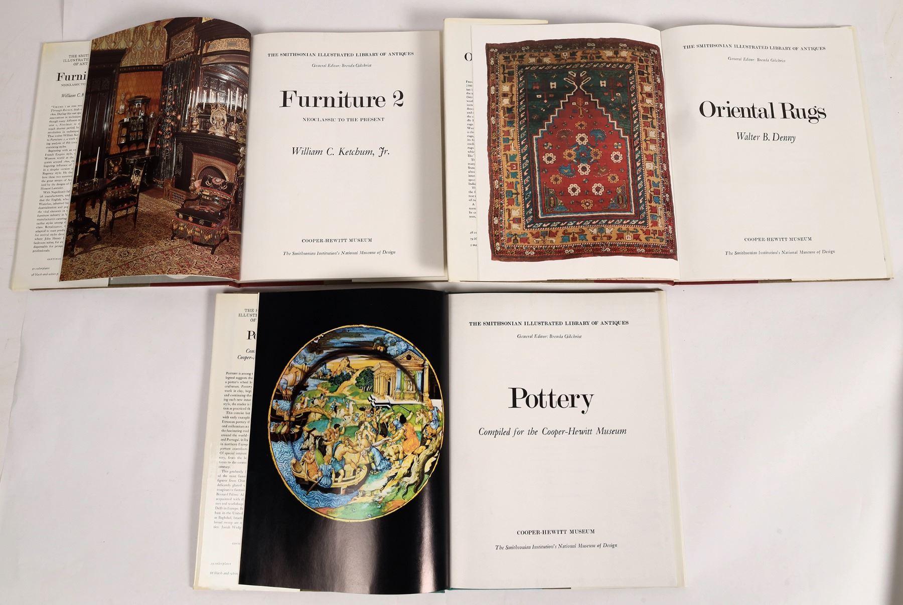 6 hardcover collector series book by The Smithsonian, Oriental Rugs, Furniture, Needlework, Pottery. Clocks. Miniatures. 1981 edition with lots of illustrations.