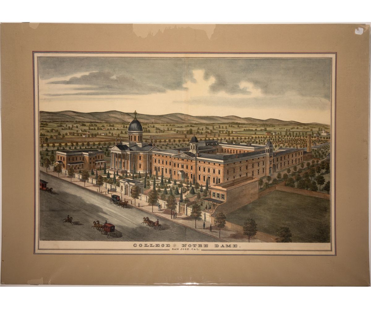 Very detailed color lithograph (matted, 22.5" H x 33" W) of the College of Notre Dame in San Jose, from the Santa Clara County Atlas. Drawn by C. L. Smith. It depicts the school, people, carriages, with the hills in the background. Burger Collection