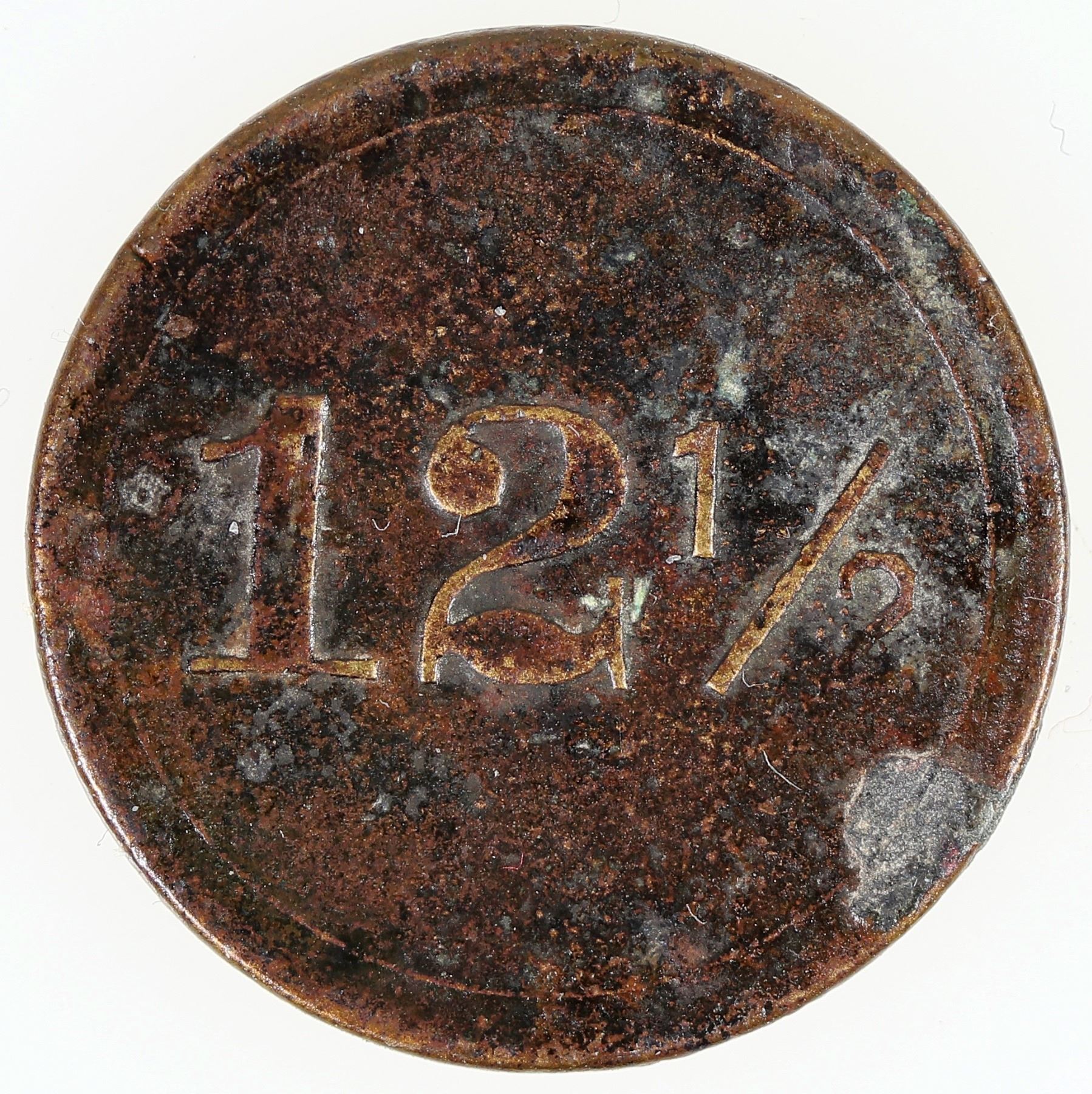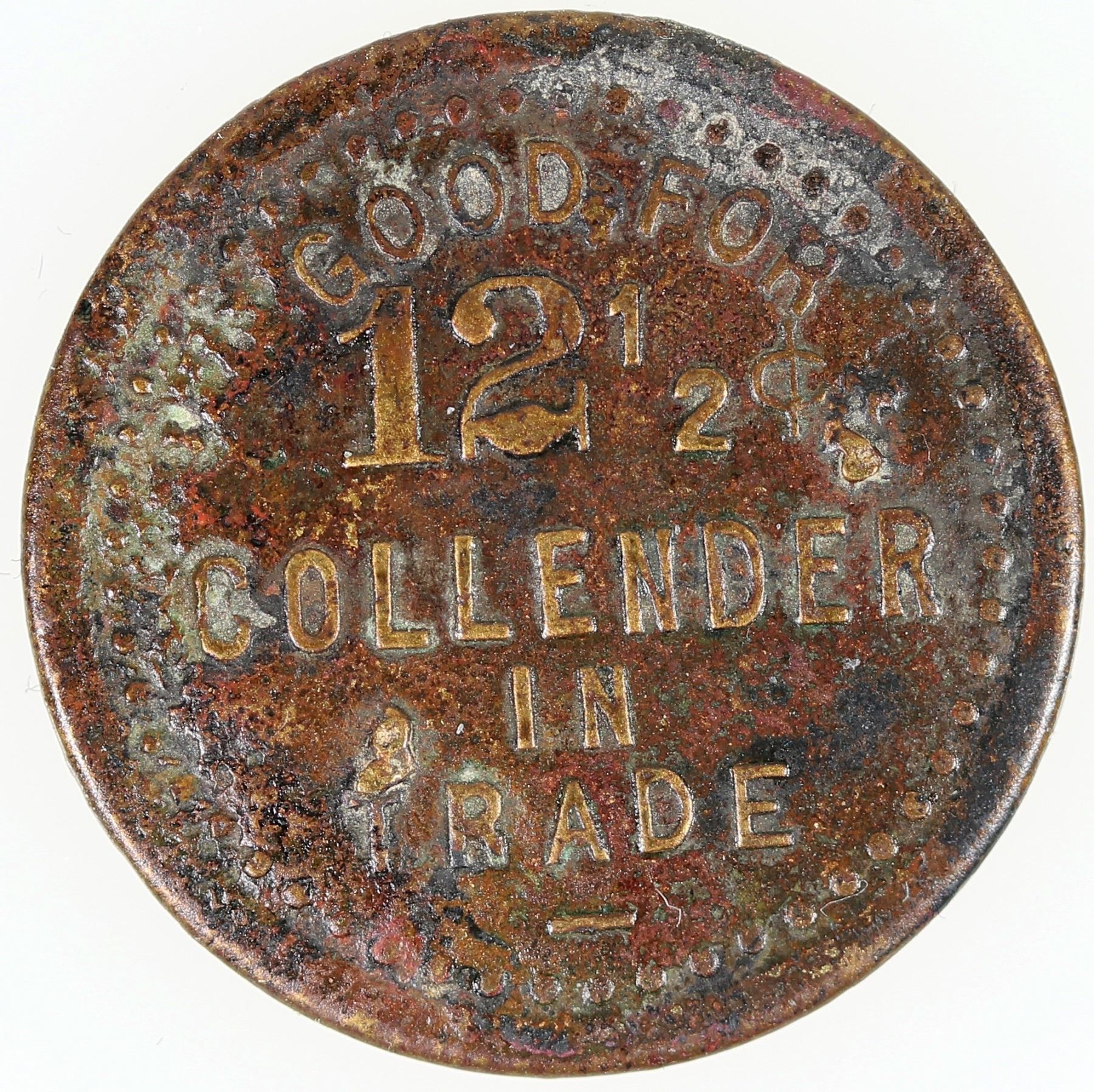 Round, 25mm, brass token Good For/ 12 1/2 c / Collender/ in/ trade//12 1/2.
