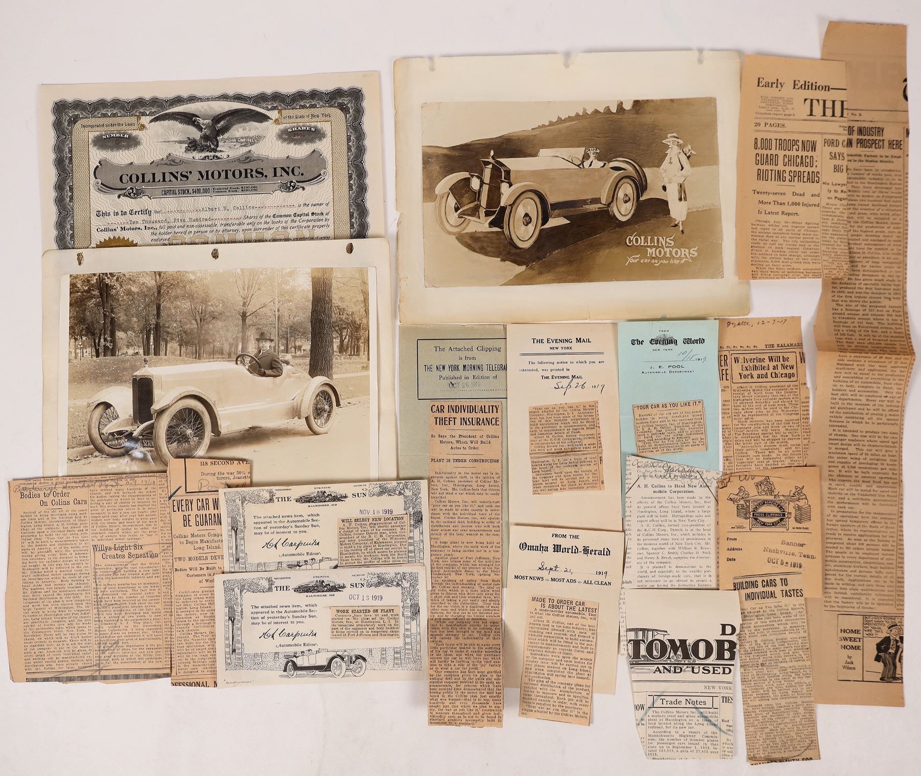 1919 Collins Motors Corp. Stock. Lot of 16. Two photos: one of the actual car and the ad that was to be placed. 13 newspaper articles regarding the company. One stock cert : Incorp. State of New York 1919. #6, I/U, 2500 shares @ $10 ea. preferred stock Issued to Albert H. Collins Nov. 15, 1919. Signed by Albert H. Collins president, Spencer C. Smith treas. Black border eagle vignette on top, gold corp. seal lower left, Goes printer. Tri-fold, no pin holes in very good cond. Albert Collins was a noted auto designer of the time and created with a streamlined four door design. He felt there was a niche for custom built autos. Gathering notable investors raising $400,000. The cars were to built around the customers desires and measurements. Duesenberg engines were to be used. Company slogan " Your Car As You Like It". Cost was not a consideration. Rare stock with hard to find articles and photos. Ken Prag Collection