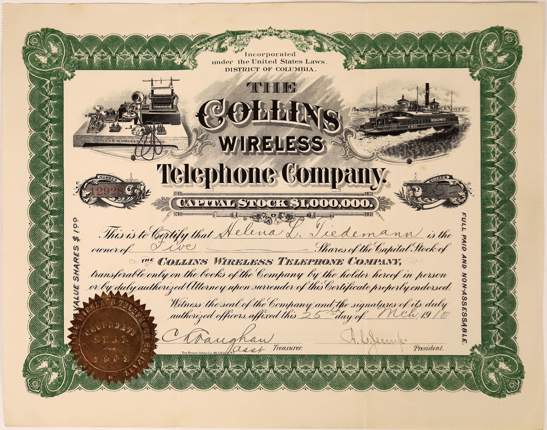 Inc. in 1903 in the District of Columbia. No. 12928, issued for 5 shares to Helena L. Tiedemann on March 25th, 1910. Signed by president AC Jessup and the asst. treasurer. Not cancelled. Green border, black print, gold seal, and two vignettes: steamboat and the Collins wireless telephone. Printed by The Broun-Green Co., NY. Deep folds. 9 x 11.5" In 1903, A. Frederick Collins formed the Collins Marine Wireless Telephone Co, and then changed the name to Collins Wireless Telephone Co. Collins travelled the country demonstrating his technology by placing devices in two hotel rooms. In December 1909, Collins Wireless Telephone Company became a part of the Continental Wireless Tel. & Tel. Company, with A. Frederick Collins as Technical Director. The stock prospectus promised A Collins wireless telephone was to be installed in each Continental station. In December 1911, four officers of the Continental Wireless Co. were indicted for using the mails to defraud in selling worthless stock. [Ref: sparksmuseum.com]