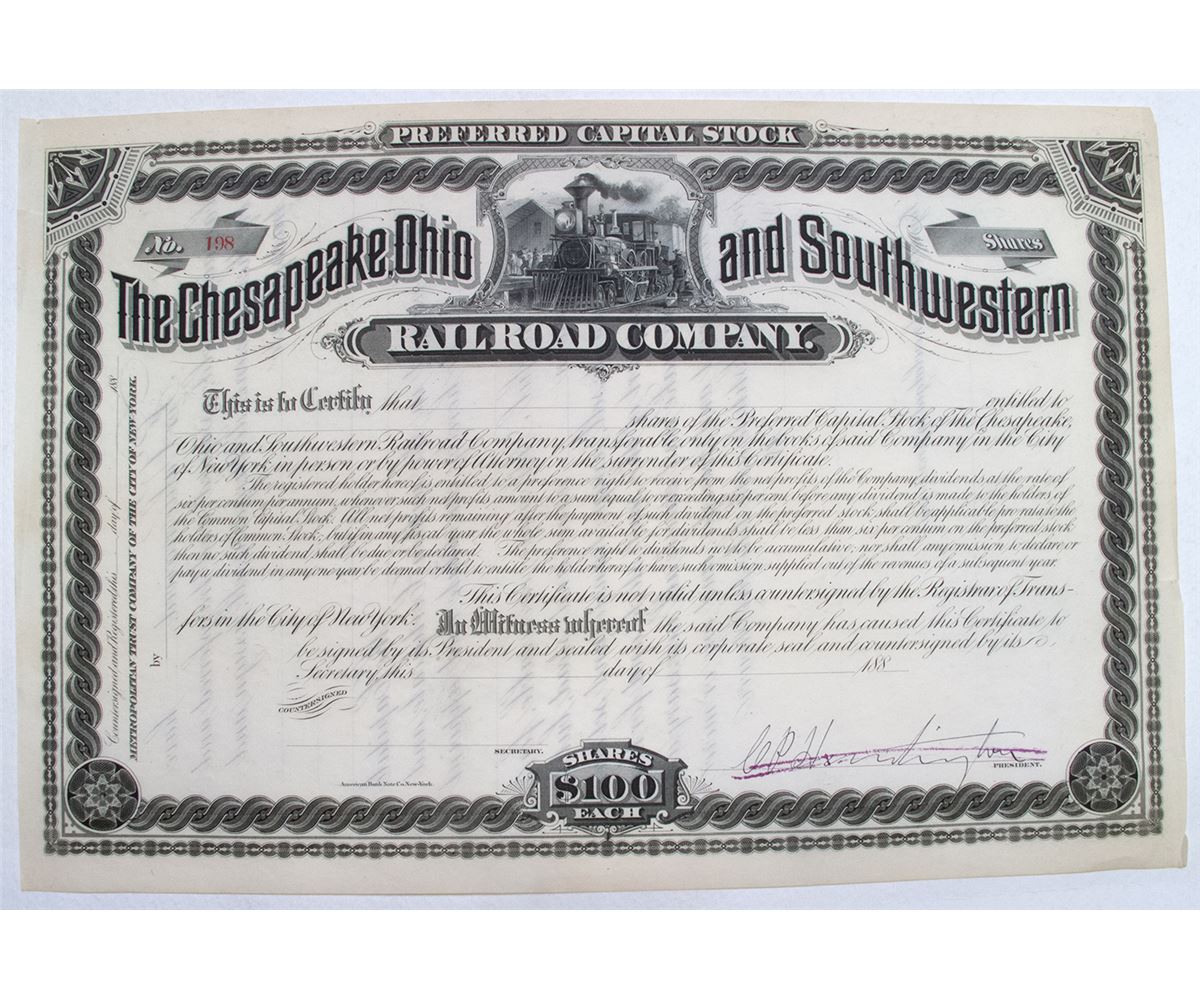 The Chesapeake, Ohio and Southwestern Railroad Company unissued stock certificate signed by Collis P. Huntington.