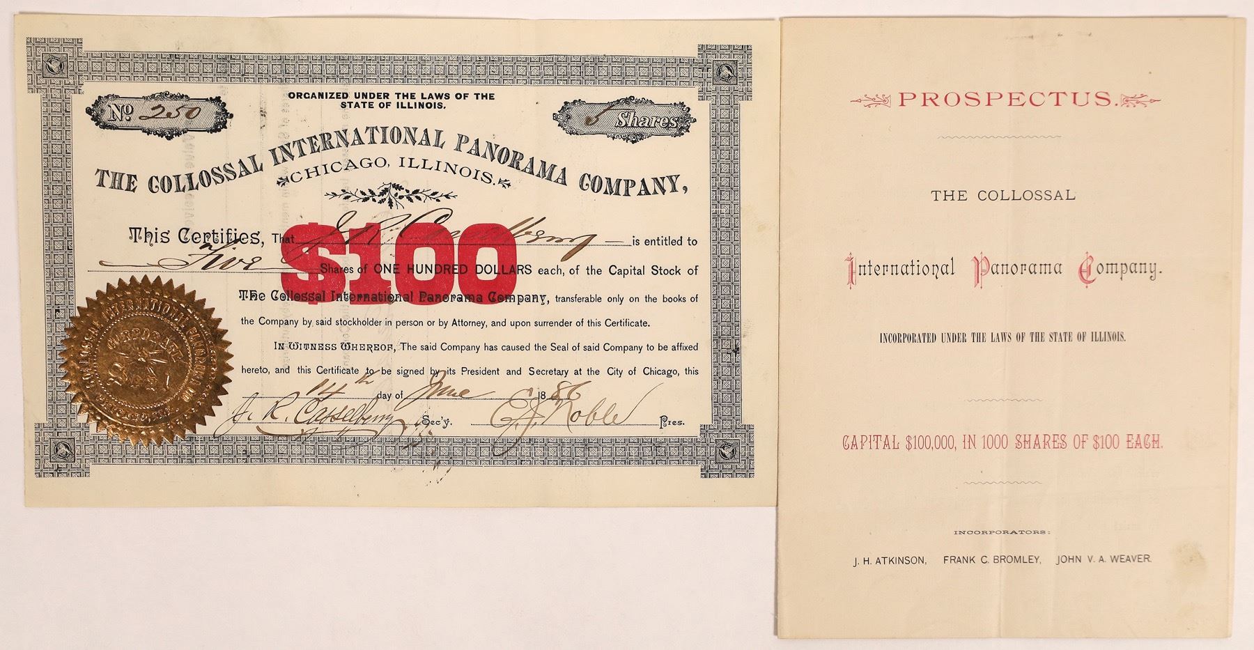 Lot of 3: 1) Stock certificate no. 250, issued in 1886 for 5 shares to the company secretary. Also signed by president Noble. Not cancelled; 2) Prospectus. 8 x 5.75". "This Company purposes to place before the Public a series of Views illustrative of Gen. Grant's trip around the world, giving by a continuous Panorama...It is proposed to illustrate this by Movable Canvas...There will be 850 feet of continuous Canvas." Artist will be F.C. Bromley; 3) Business card for the company, office in Chicago.