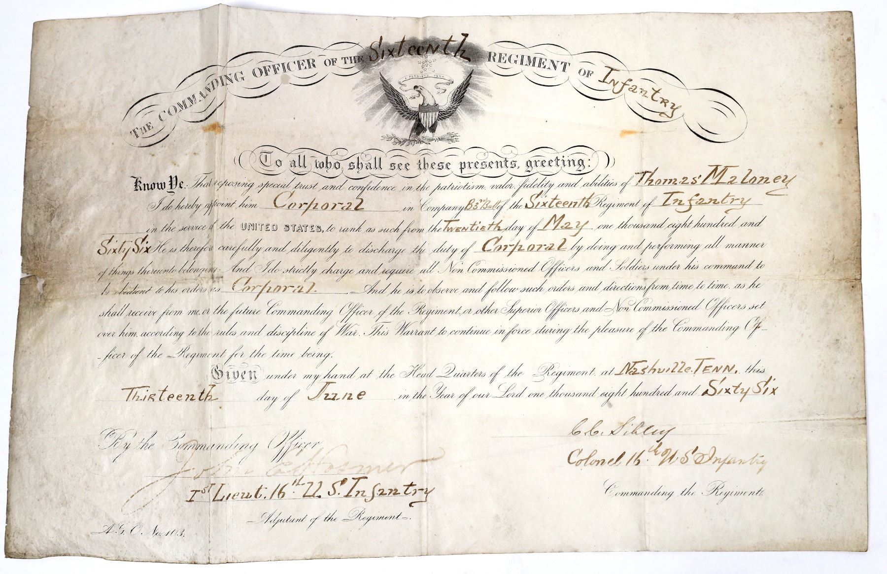 This document is signed by Colonel Caleb Chase Sibley of the 16th U.S. Infantry on June 13, 1866 giving a promotion to a Thomas Maloney. 10 in. x 16 in. with folds and several small holes. C.C. Sibley was a graduate of West Point USMA. Please see photo for details, suitable for framing.