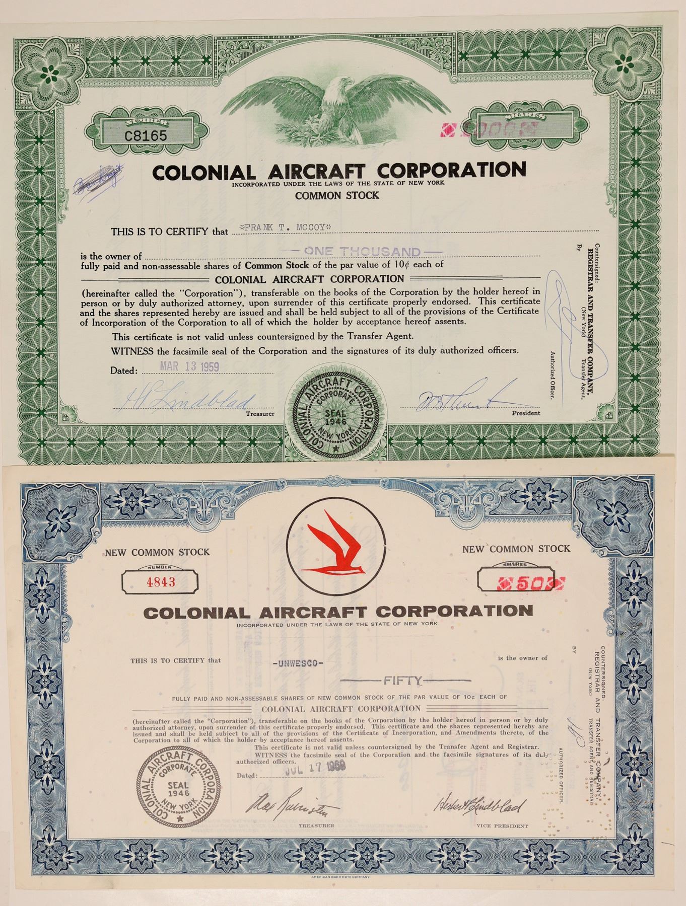 Lot of two. 1) 1959 black and green. # C8165. Signed by president Hunt and secretary Lindblad. Crossed out ink writing upper left. Otherwise nice. 2) 1969 blue, black and nice red logo vignette. Signed by president Lindblad this time. Light discoloration. Ken Prag Collection