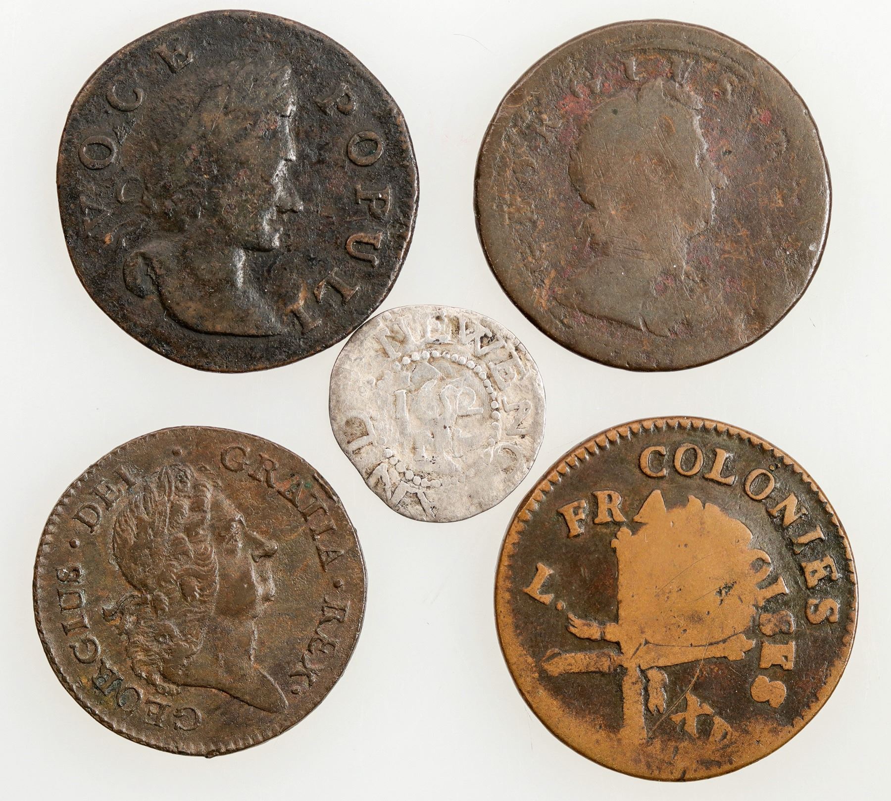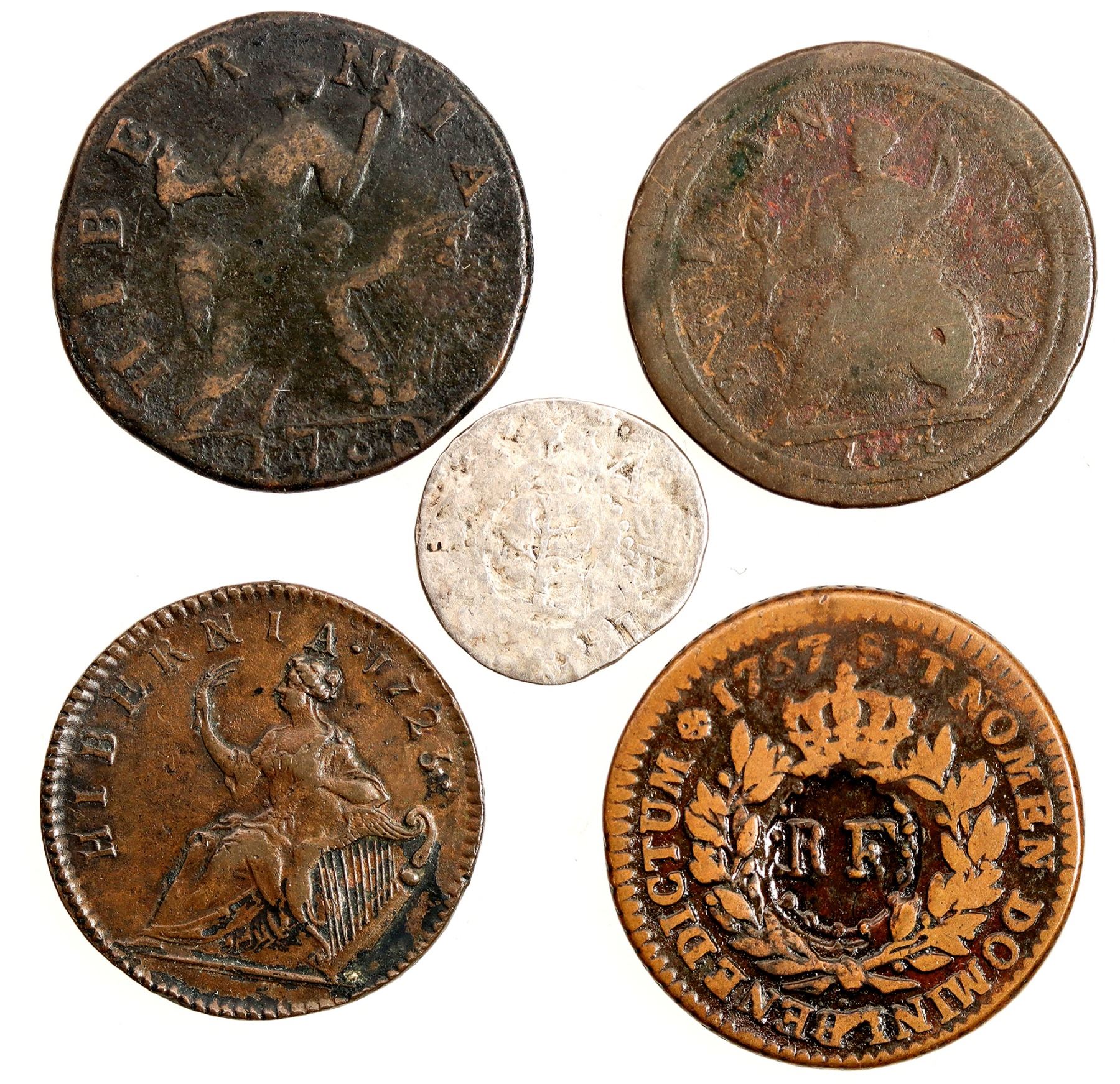 Lot of five Colonial coins: 1) 1760 Hibernia-Vove Populi coin, G-VG; 2) 1767 French Colonies Sou, counterstamped RF, G-VG; 3) 1723 Woods Hibernia half penny, G-VG; 4) 1652 Massachusetts Pine Tree three pence, Fair-AG; 5) 1724 George I half penny, Woods coinage, Fair-AG.