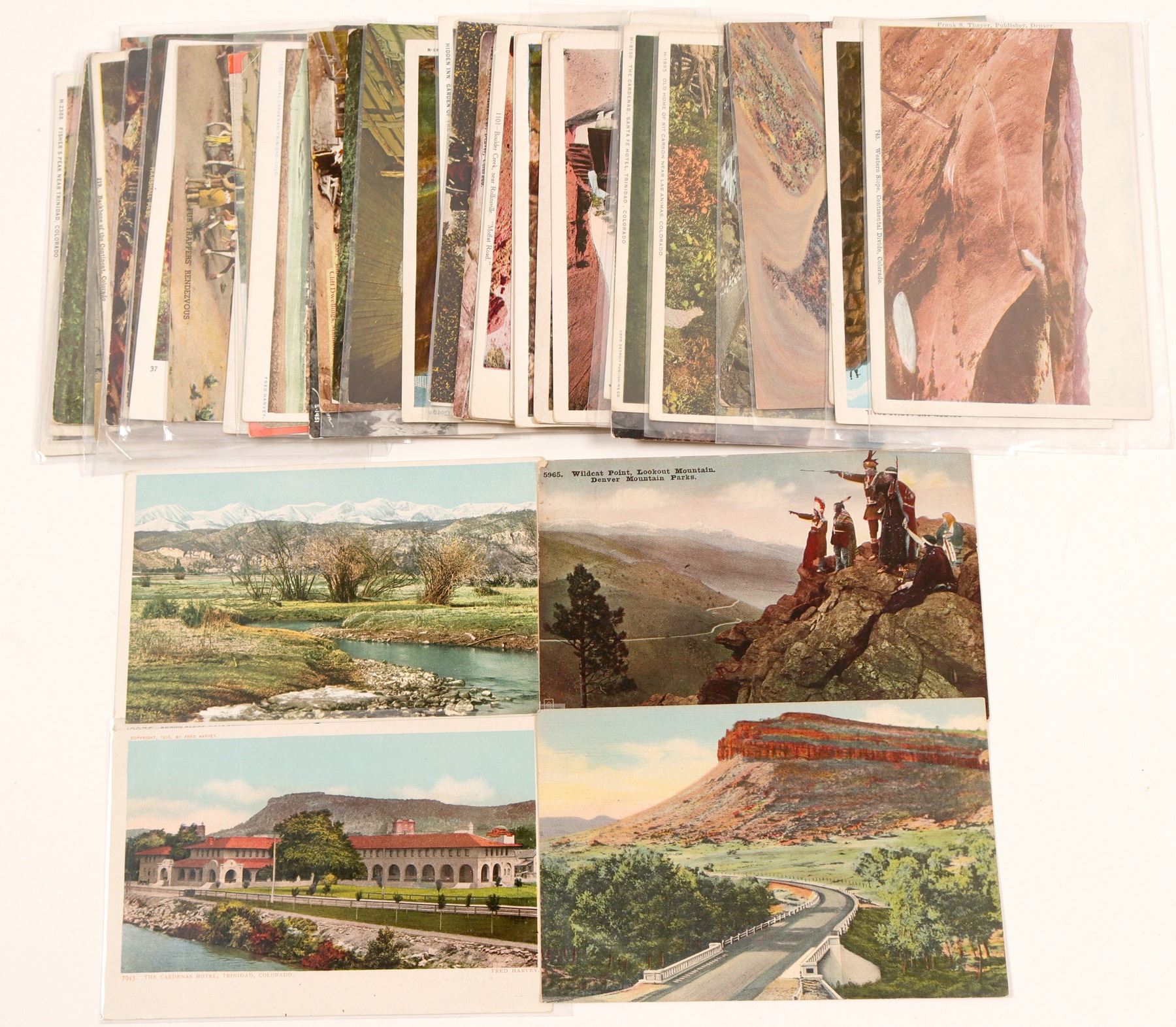 45 different and 3 duplicates of colorful picture postcards of the state of Colorado. Postcards include Indians at Balanced Rock in Mushroom Park, numerous scenic views from Lookout Mountain and Garden of the Gods. There are 41 state parks and 307 wildlife areas of Colorado.