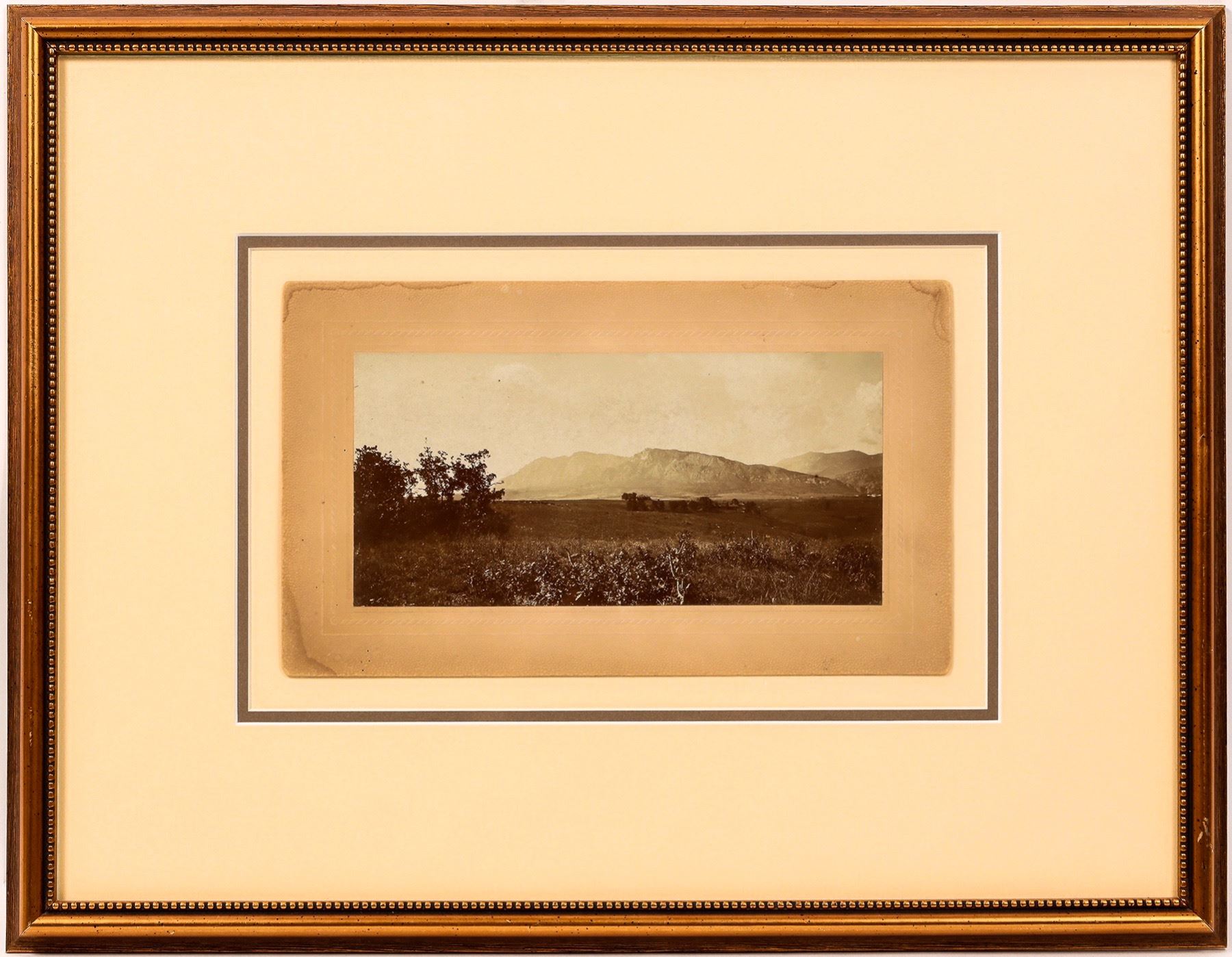 Two nicely framed images of Colorado agriculture. 1.Framed cabinet card showcasing the landscape and agriculture of Colorado with nice mountain scenery in the background. Measures 17 " x 13." 2. Framed & matted engraving from Mount Washington from the Valley of Conway. From notable Eastern engraver James Smillie (1833-1909). Steel engraving; American Art Union 1851. After the painting of John F. Kensett. Frame measures 22 " x 18 1/2." Both from Nelson A. "Buz" Rieger's exhibition "Rush to the Rockies."