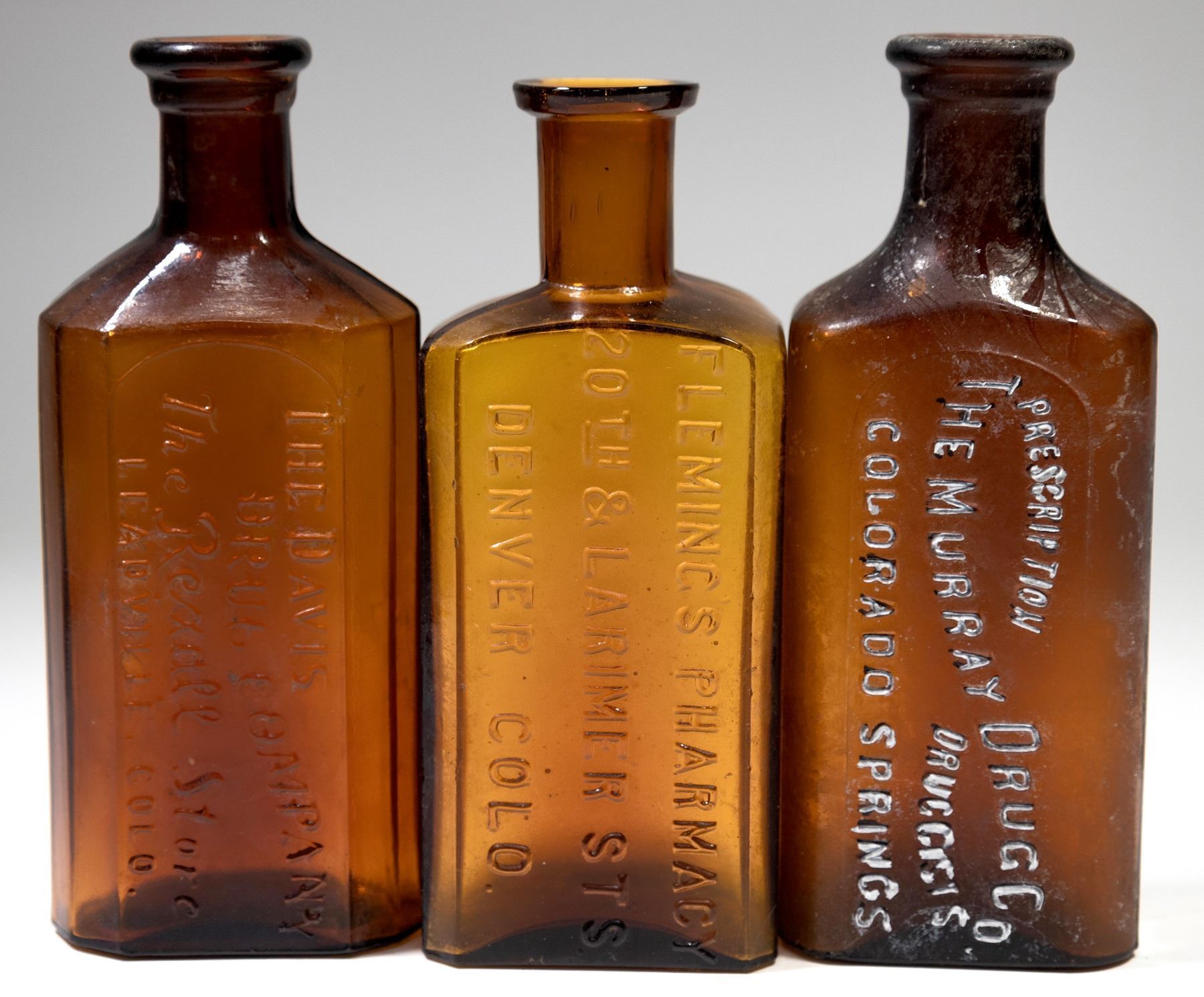 3 Colorado amber drug bottles. The Murray Drug Co./Colorado Springs. Fleming's Pharmacy/20th & Larimer Sts/Denver, Colo. The Davis Drug Company/The Rexall Store/Leadville, Colo. No apparent chips or cracks. Dimensions: #1 David/Leadville - 5 1/4"; #2 Flemming - 5"; #3 Murray - 5".