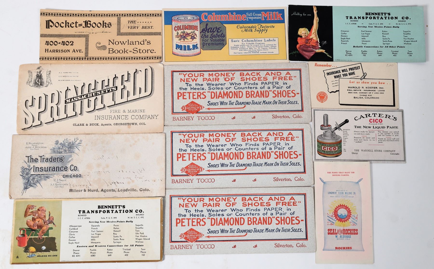 Lot of 12 rare antique blotters from businesses in Colorado. These blotters are advertisements for the various businesses. Various sizes, largest is approx. 9 x 4.5 inches. Good condition.