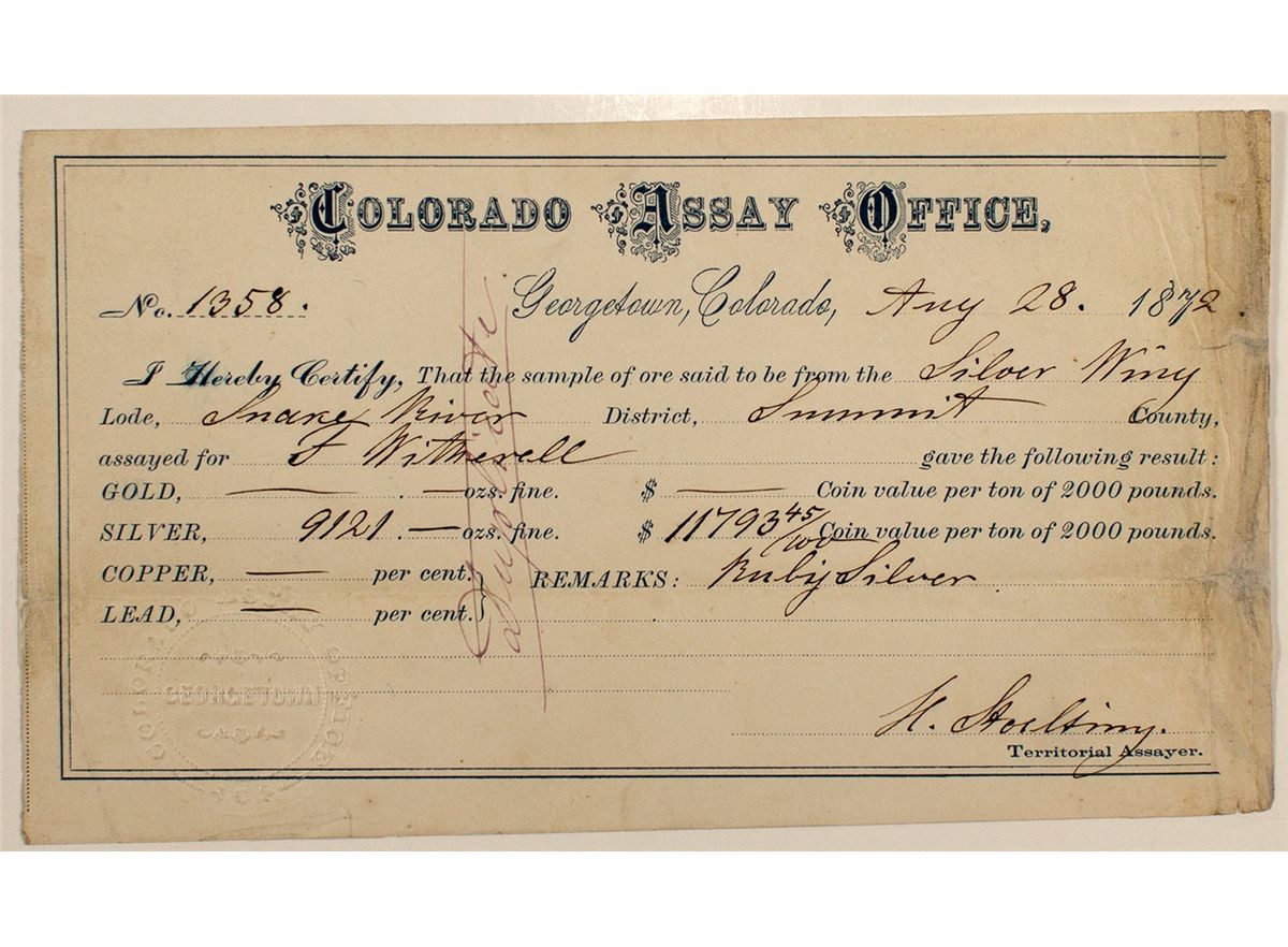 Very rare. Territorial. Assay Receipt #1358 for ore from the Silver Wing Lode, Snake River District, Summit County. Assayed for F. Witherell on Febry. 28, 1872. 9121 ozs. fine silver. Remarks: "Ruby Silver." Signed by H. Stoelting as Territorial Assayer. Snake River District was located in Summit County, 12 miles east of Dillon, CO. F. Witherell probably refers to W. Frank Witherell, a mining engineer and financier operating in Colorado in the 1870s. Condition: some toning. Right corner crinkled. Measures 7 1/4" x 4"City: GeorgetownCounty: Clear CreekState: CODate: