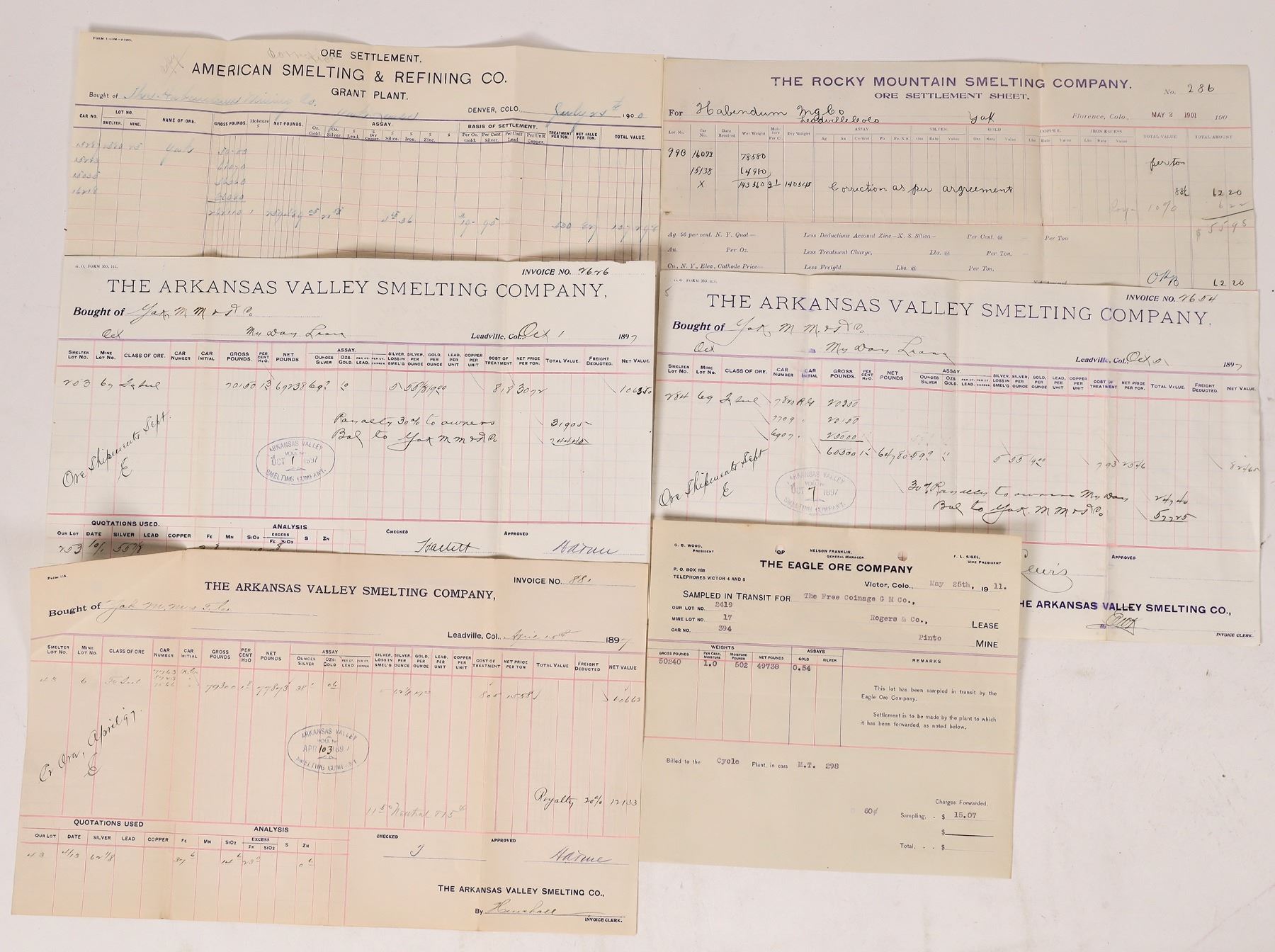Seven documents from various smelting companies or sampling works, c 1897-1911. Includes ASARCO Denver (1900, Habendum MC, Leadville); Arkansas Valley Smelting (1897, Yak Mine, Leadville) (3); Rocky Mtn Smelter (1901, Habendum MC, Leadville); Eagle Ore Co., Victor (1911); Chamberlain Sampling Works (1895) Idaho Springs. Colorado Franklin Collection