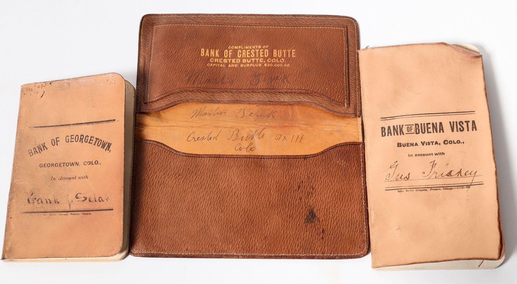 Lot of two bank books and a wallet (?) from three different banks in Colorado. These are the Bank of Georgetown, Bank of Buena Vista, and the Bank of Crested Butte. All three have the name of the person they belonged to written on the front. Various sizes, largest is 6.5 x 3.5 inches. Good condition.