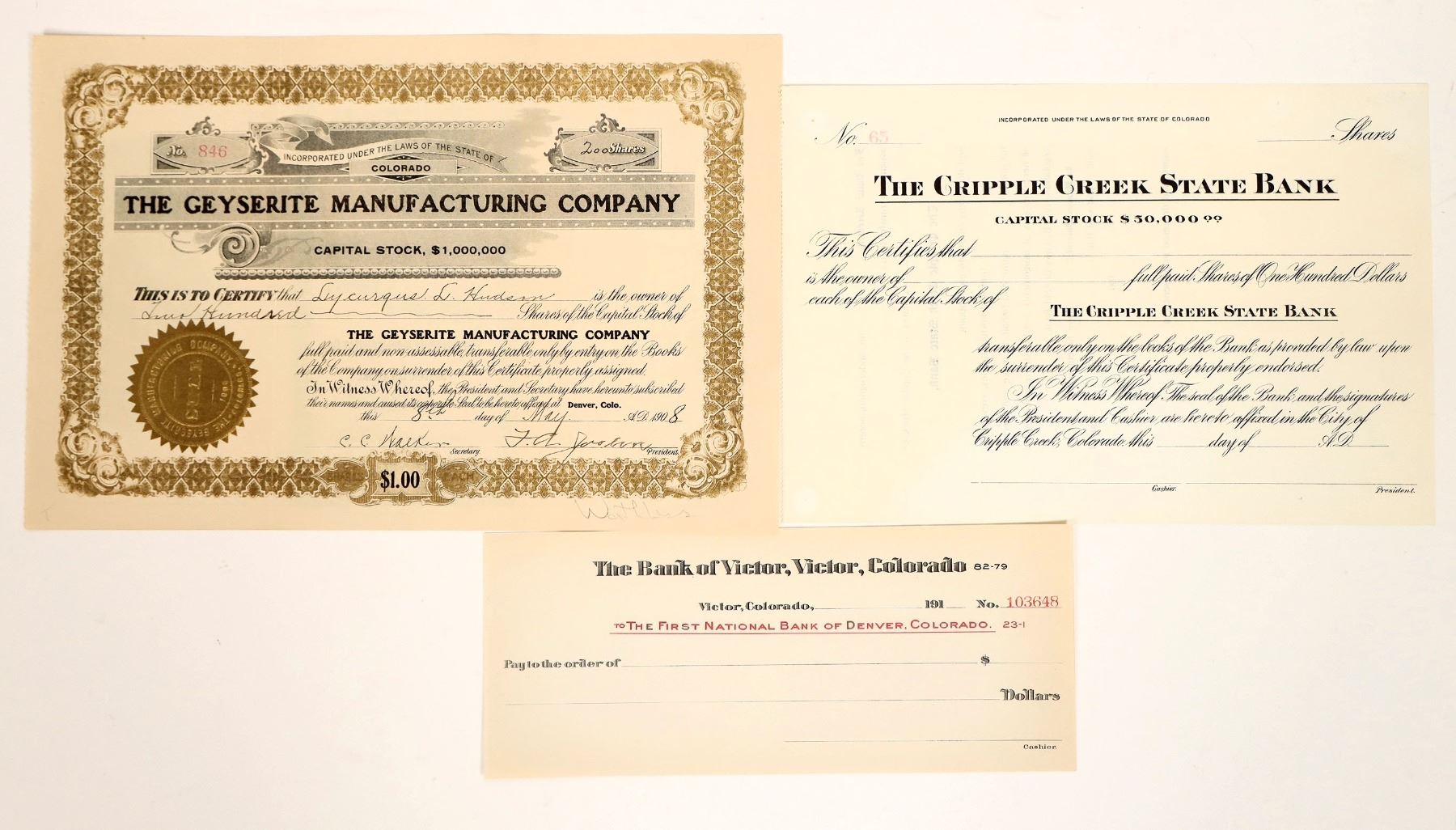 Collection of 3 stock certificates from Colorado, c190X-191X. Includes: The Cripple Creek State Bank, Cripple Creek, Colo., No. 65, unissued, c190X; The Bank of Victor, Victor, Colo., No. 103648, unissued, c191X; The Geyserite Manufacturing Co., Denver, Colo., No. 846, 1908, 200 shares, signed by president and secretary.