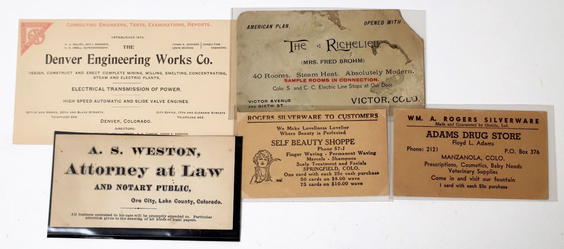 Lot of five business cards from Colorado. They are for A.S. Weston Attorney at Law, The Richelieu (hotel in Victor), Denver Engineering Works Co., and Wm. A. Rogers Silverware (2). Different sizes, largest is 5.25 x 3 inches.