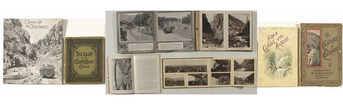 Lot of four. 1) The Canons of Colorado" from photographs by W. H. Jackson and printed and bound in Denver. Snap cover, Cabinet-type photographs - sixteen of them. 2) "The Loop and Clear Creek Canon". One long foldout with many pictures. Duo-tone photographs. 54" long. 3) "A Day in the Canons of the Rockies." 1898. Fifth edition. 48 pages. Many photographs! 4) "Come up to Colorado." 32 pages. Two maps and lots of photos.