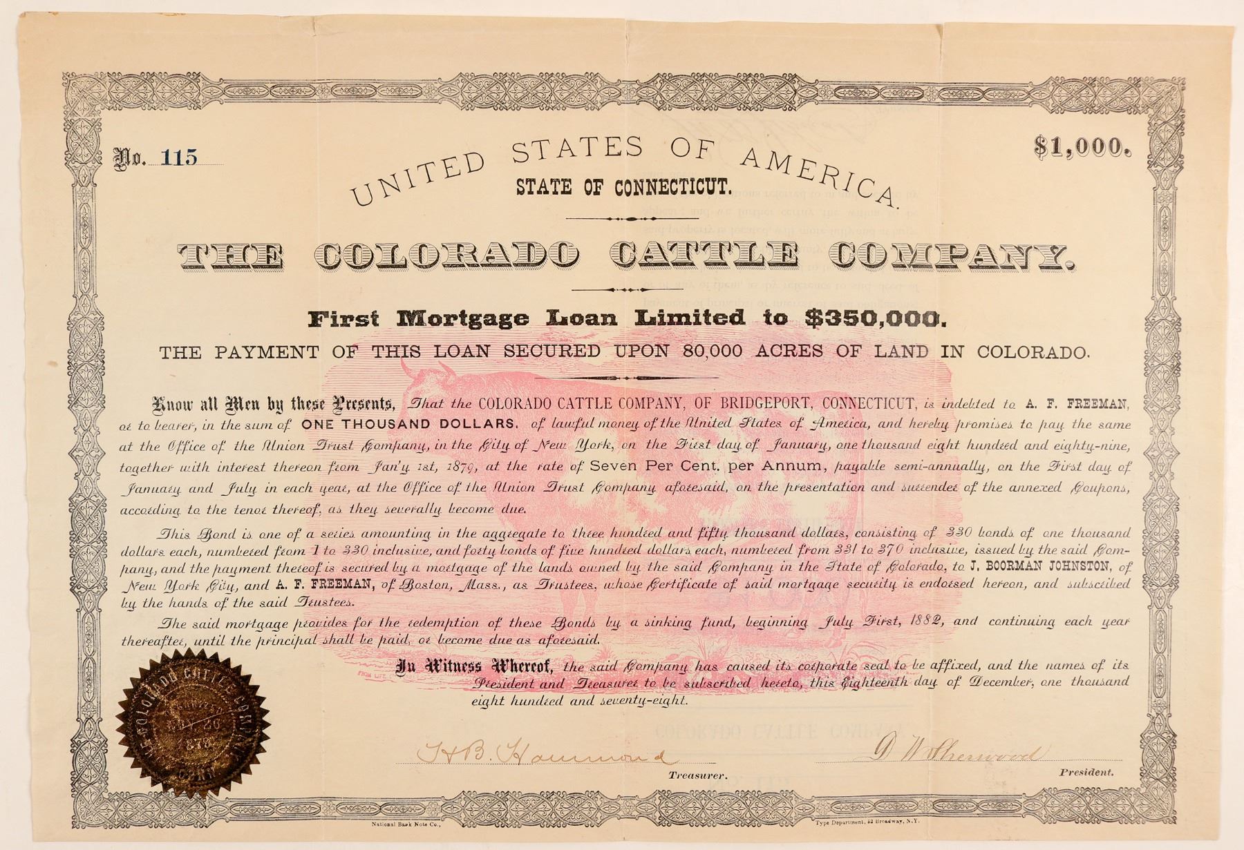 Extra rare. Issued during the Colorado Sheep & Cattle War period. Inc. in Connecticut. No. 115, issued for $1,000 to A.F. Freeman on Dec. 18th, 1878. Signed by president DW Sherwood and treasurer HB Hammond. Black border, gold seal, and large pink vignette of a cow in the background. Printed by National Bank Note Co. Seventeen coupons attached. 16 x 13.5" Folds with some separation occurring and toning. The Sheep and Cattle Wars were a series of armed conflicts in the Western United States which were fought between sheepmen and cattlemen over grazing rights. The fighting between Colorado and Wyoming was especially violent. The Colorado cattlemen did not want to share their pastures with the sheepherders, who were crossing into the state from southern Wyoming. There were about twenty-four attacks and at least six deaths between 1879 and 1909 in Wyoming. William Craig (the Hermosilla Estate), PT Barnum and David W. Sherman sold their ranches to the Colorado Cattle Company in 1878 for $320,000. By 1881, it had 30,000 head of cattle. Many of the investors were from Bridgeport, Connecticut. The enterprise was not successful and in 1880, the company was in court in foreclosure proceeding. () Ken Prag Collection