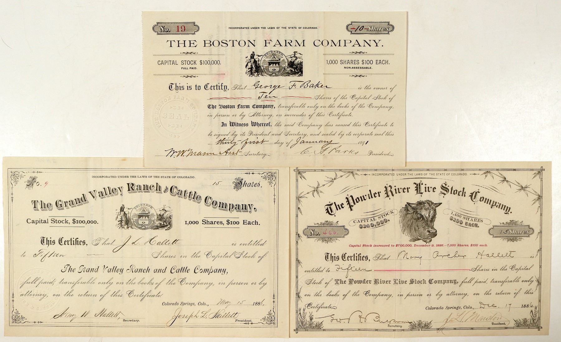 Lot of 3 different. All are in very good condition. 1) The Powder River Live Stock Company. Issued in 1886 in Colorado Springs. Not cancelled. Vignette of cow's head. 2) The Grand Valley Ranch & Cattle Company. Low cert. number 9 issued in 1886 to the company president in Colorado Springs. Not cancelled. 3) The Boston Farm Company. No. 19, issued in 1891. Not cancelled. From A Denver Colorado Prospector newspaper article: "The Boston Farm Company owns 6,000 acres of land south of Numa and Ordway, under the Colorado Land and Water Company’s canal. They are now working forty teams and a steam plow, and have already planted about one thousand acres of oats and alfalfa." () Ken Prag Collection
