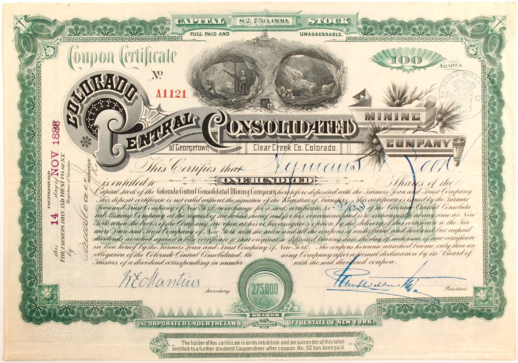 The stock certificate was sold in Holland (very unusual!) as evidenced by the circular stamp in the upper right corner. # A1121 for 3703 shares to Hyman. Signed by WE Mantius and (?) for president. Clear Creek County. Like a bond there are attached coupons - numbers 37 to 50 still attached. Two mining tunnel vignettes. With attached coupons measures 12 x 11".