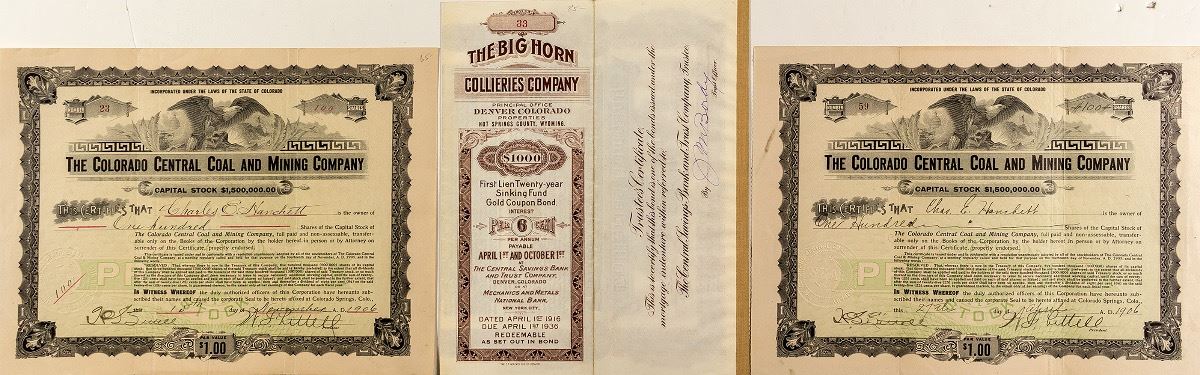 Lot of three. 1) Two stock certificates for The Colorado Central Coal and Mining Company. Both issued in Colorado Springs in 1906. Neither is cancelled. Black floral border and eagle vignette. Folds and bent corners. 2) $1,000 bond The Big Horn Collieries Company issued 1916. Not cancelled. Eighteen coupons attached. Brown border with ornate logo. (Prag Collection) City: State: Colorado Date: 1906-1916 ID# 34250