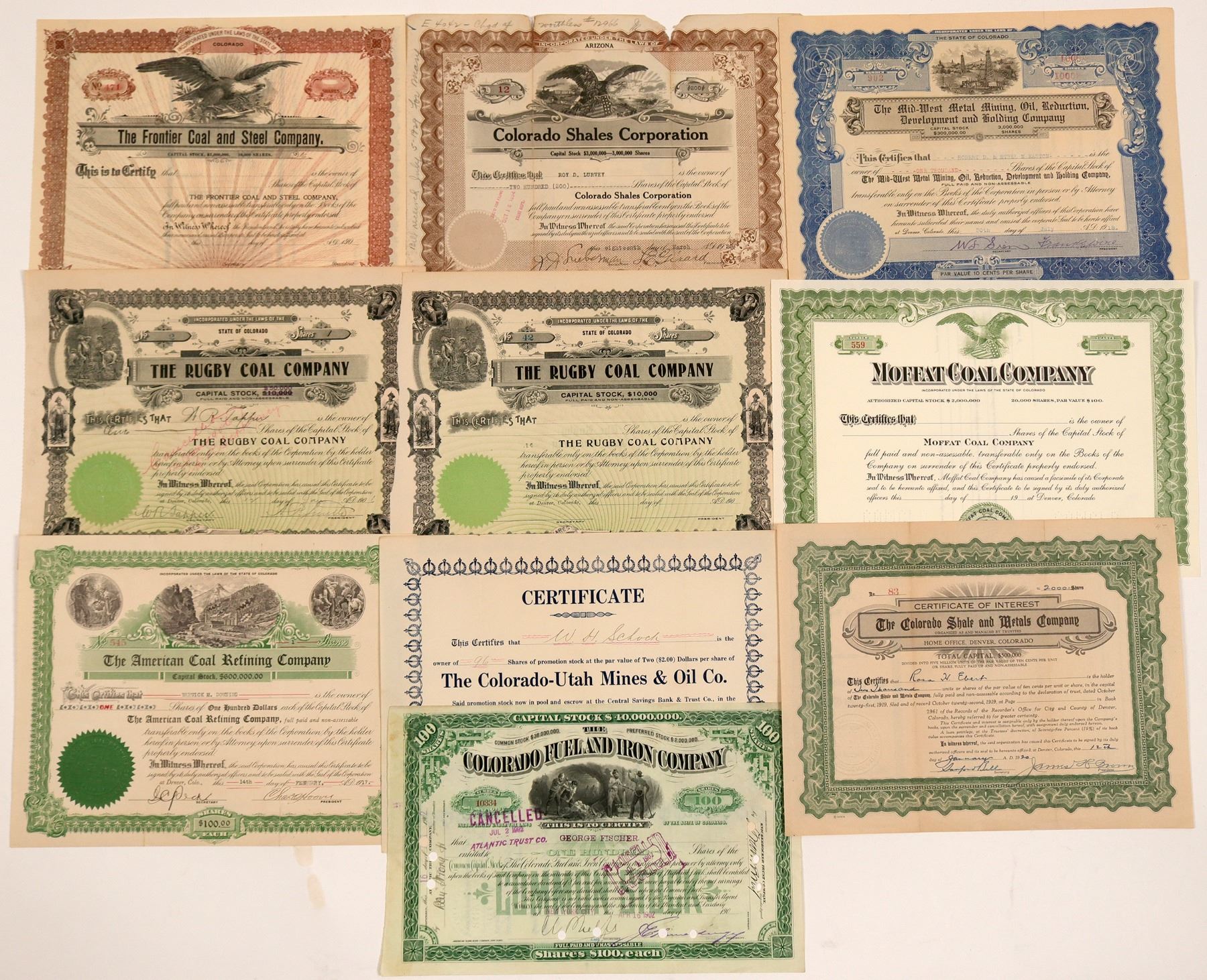 Lot of 10, most different. Included: Frontier Coal & Steel Company (unissued); Colorado Shale & Metals Company (1920); Colorado-Utah Mines & Oil Co. (issued but no date); American Coal Refining Co. (1917, mining vignettes); Moffat Coal Company (unissued); Rugby Coal Company (issued in 1906 and unissued); Mid-West Metal Mining, Oil, Reduction, Development and Holding Co. (1918, oil derrick vignette); Colorado Shales Corporation (issued in 1920, eagle vignette); and Colorado Fuel & Iron Company (1902, mining vignette). Condition is fair to good with folds, some separation, and toning. Please inspect. Ken Prag Collection