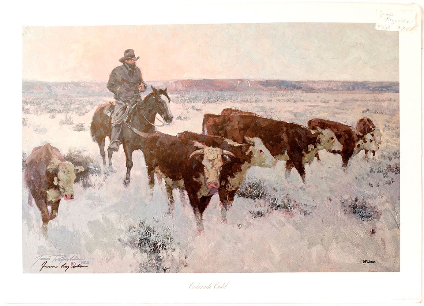 This is a 28.5"x 20.5" lithograph by James Reynolds, entitled "Colorado Cold." It is signed by the artist and is 647 of 1000. Beautiful depiction of a cowboy in the snow. Date: Location: Colorado HWAC# 56426