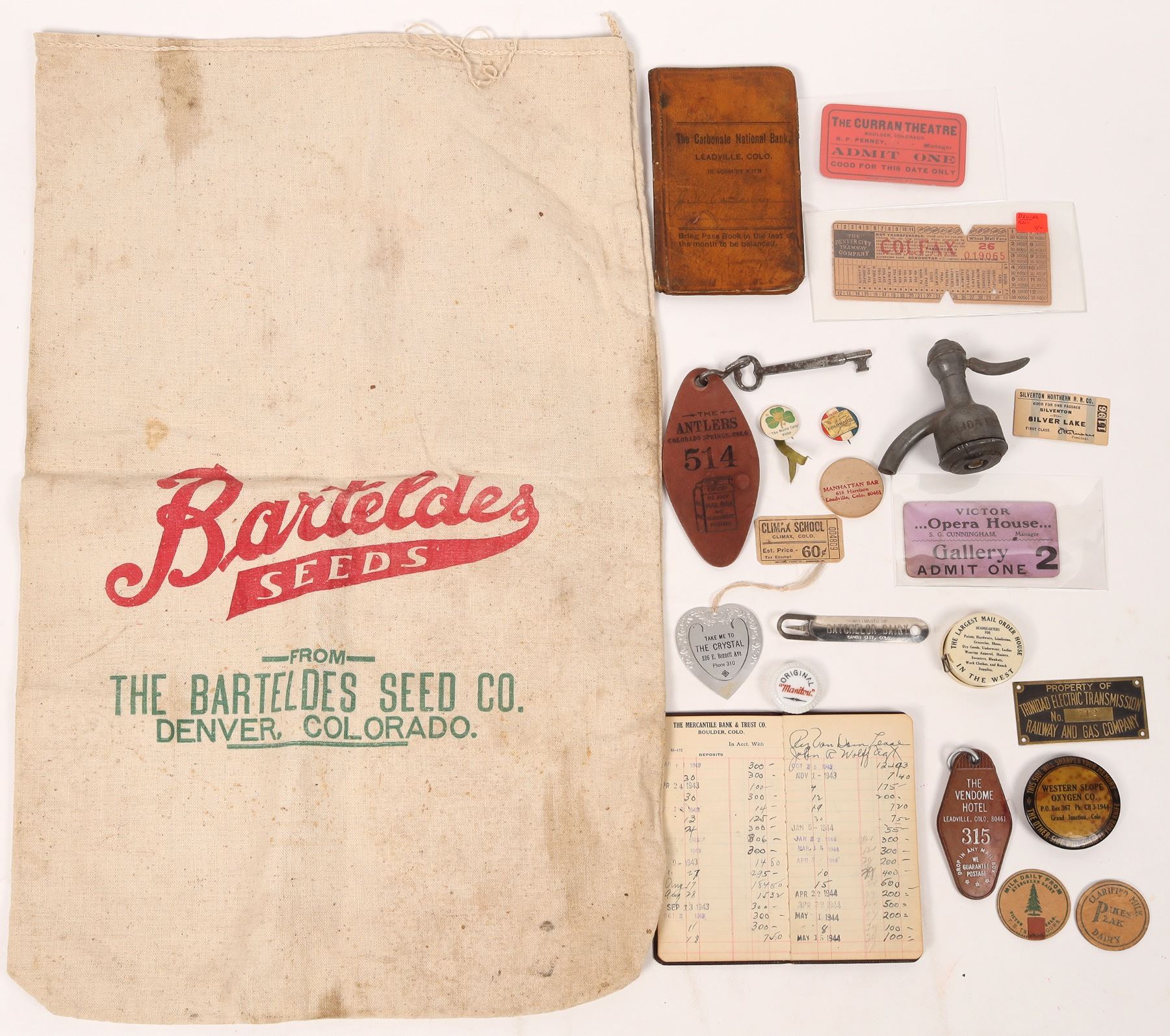 22 Colorado Collectibles. Cloth bag, Barteldes Seed Co. 22x14. Boulder Mercantile Bank notebook. Western Slop Oxygen knife sharpener. Vendome Hotel key fob, plastic. Bon I Look Stores tape measure. Victor Opera House ticket. 1921 Carbonate National Bank deposit book. The Antlers key fob. Salida Bottling seltzer spout. Original Manitou porcelain top and more.