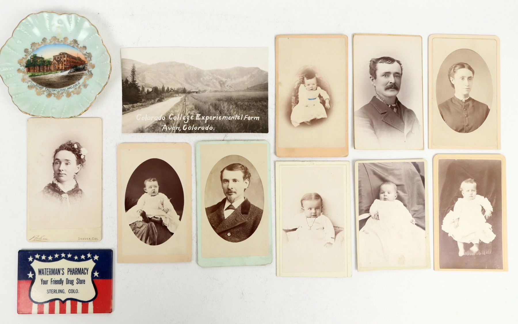 Lot of 12. Small souvenir dish, Sugar Factory Loveland , Colo.. Postcard Colorado College Experiment Farm Avon Colo. Small metal mirror , nine small portrait photos of babies and adults.