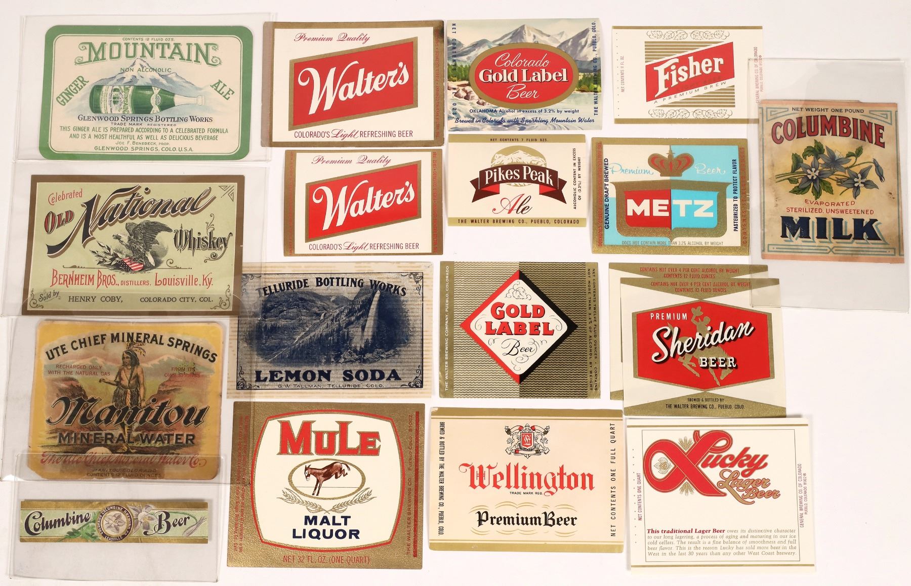 Nineteen total. Columbine Beer Leadville, Columbine Milk, Ute Chief Mineral Springs with Native American vignette, National Whiskey Colorado City, Mountain Ginger Ale Glenwood Springs, Telluride Bottling Works Lemon Soda, Mule Malt Liquor, Lucky Lager, Wellington Beer, Walters Beer, Gold Label Beer, Sheridan Beer, Metz, Fisher Beer, Pike's Peak Ale, Colorado Gold Label.