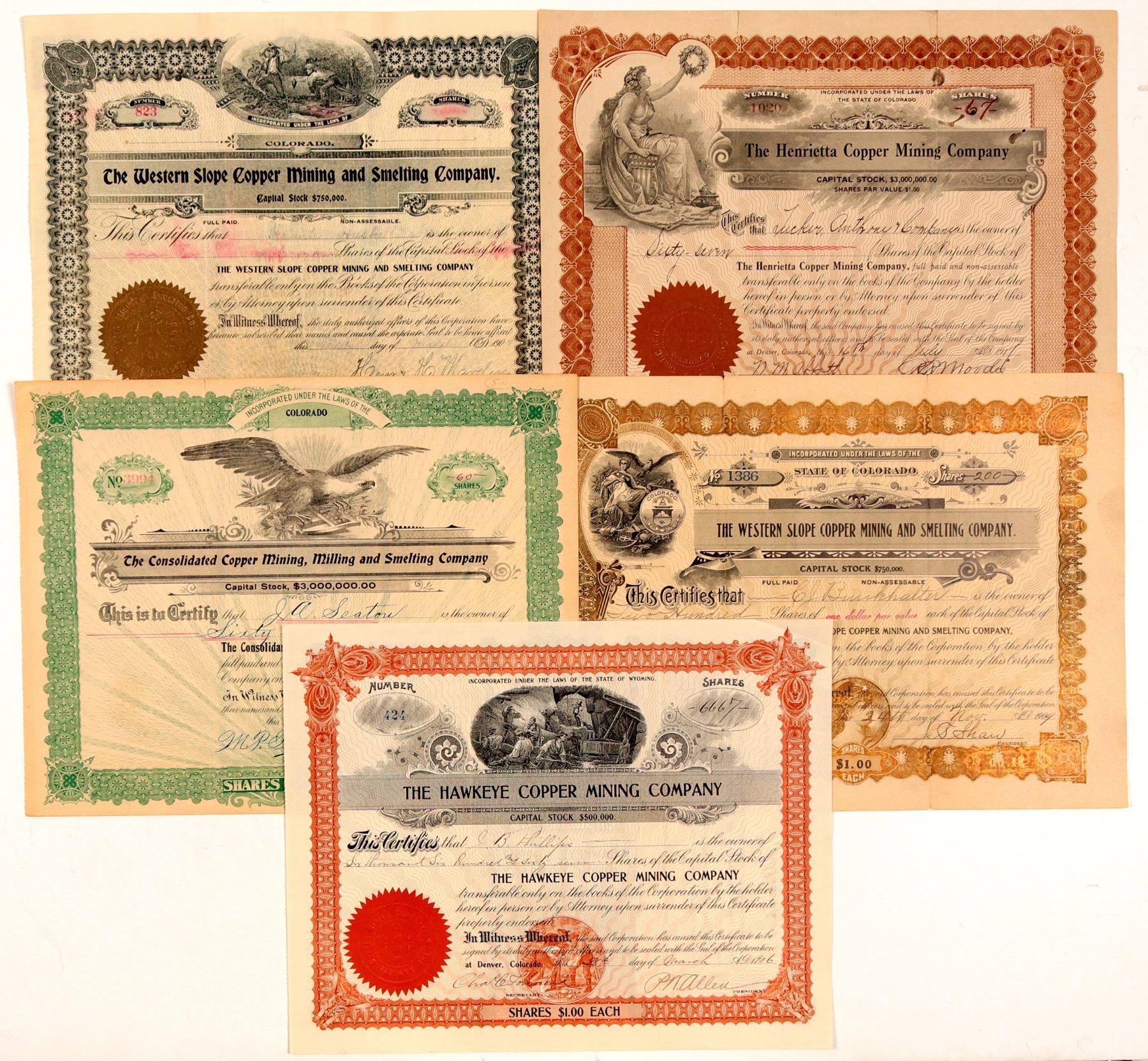 Lot of 5 different. 1) The Hawkeye Copper Mining Company. Issued in Denver in 1906, not cancelled. Maroon border, mining vignette. Folds, bent corner. 2) The Consolidated Copper Mining, Milling and Smelting Company. Issued in 1909 in Denver, not cancelled. Green border, eagle vignette. Folds, toning. 3-4) The Western Slope Copper Mining and Smelting Company. Two varieties. One issued in 1909, not cxl. Gold border and allegorical vignette. Heavy folds with some separation, toning. The other is issued in 190(?), not cxl, black border and mining vignette. Water damage. 5) The Henrietta Copper Mining Company. Issued in 1917, not cxl. Brown border, allegorical vignette. Pinholes, heavy folds with some separation, toning. Ken Prag Collection