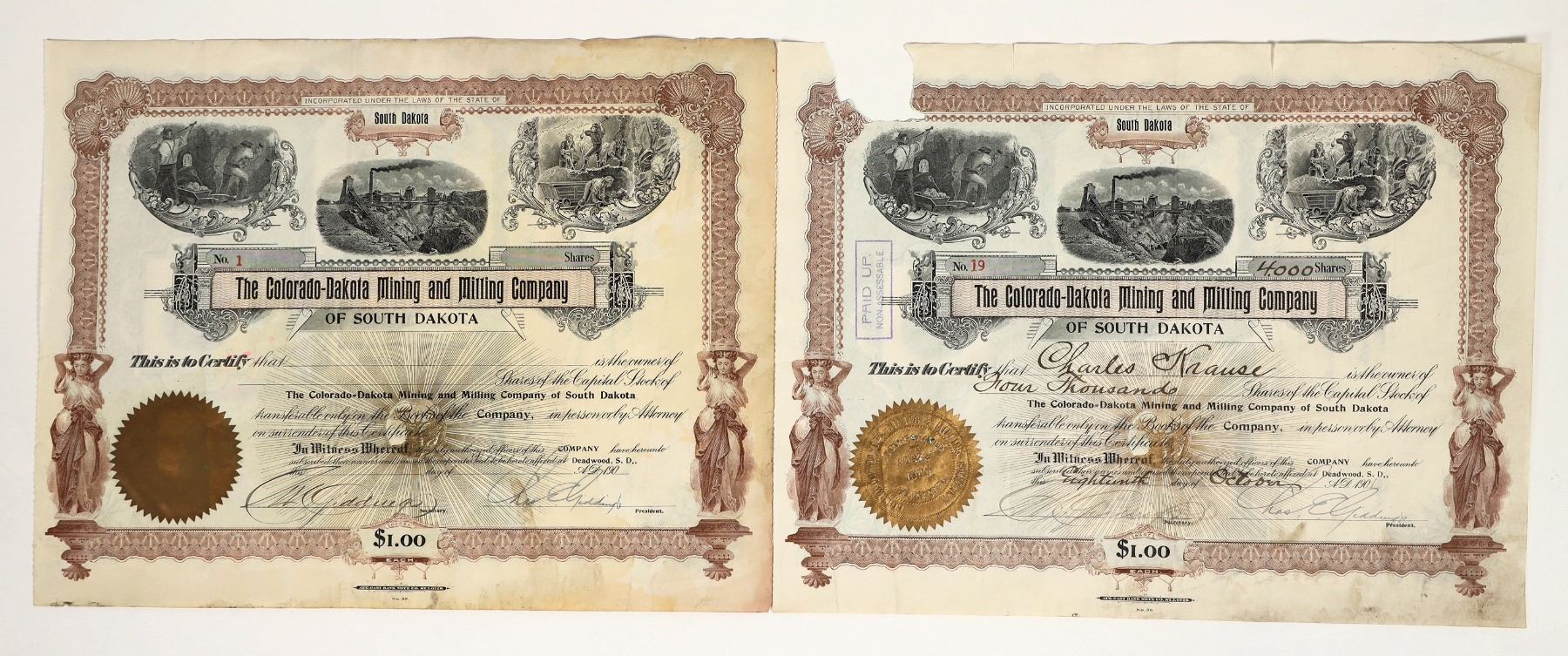 Lot of 2 different from the Homestake Collection. According to a Jan. 4, 1902 Lead Daily Call article, the company acquired 200 acres on the west flank of Bald Mountain and were planning on erecting a cyanide mill. Their mine properties were 4 miles from the Homestake and were "contiguous to and almost surrounded by the Bald Mountain, Ragged Top and Squaw Creek mines." Their claims consisted of numerous lodes including the Funston, Frost, Little Eva, Buffalo, Link Fraction, May, and others. This must have been a tightly held company. Stock number 1, included in this lot, is signed but not issued. The first issued stock present was #19, also in this lot. Both are signed by Charles Giddings as president and a different Giddings as secretary. Brown border, gold seal, and three mining vignettes. No. 19 is issued in 1901 to Charles Krause for 4,000 shares. Wrinkles, soiling, portion of upper left missing. 9.5 x 12"