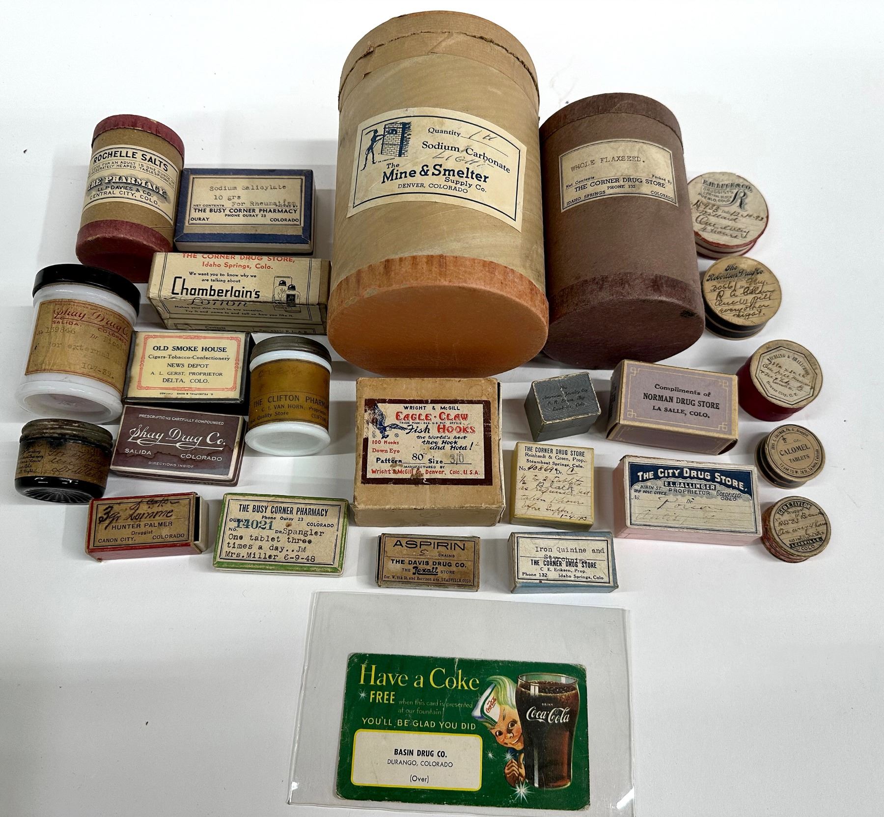 About 15 Colorado drug store boxes. Eagle Claw Fish Hooks with contents, Sodium carbonate, flaxseed, RX's etc. About 1x1.25" to 6x4.25". See photo.