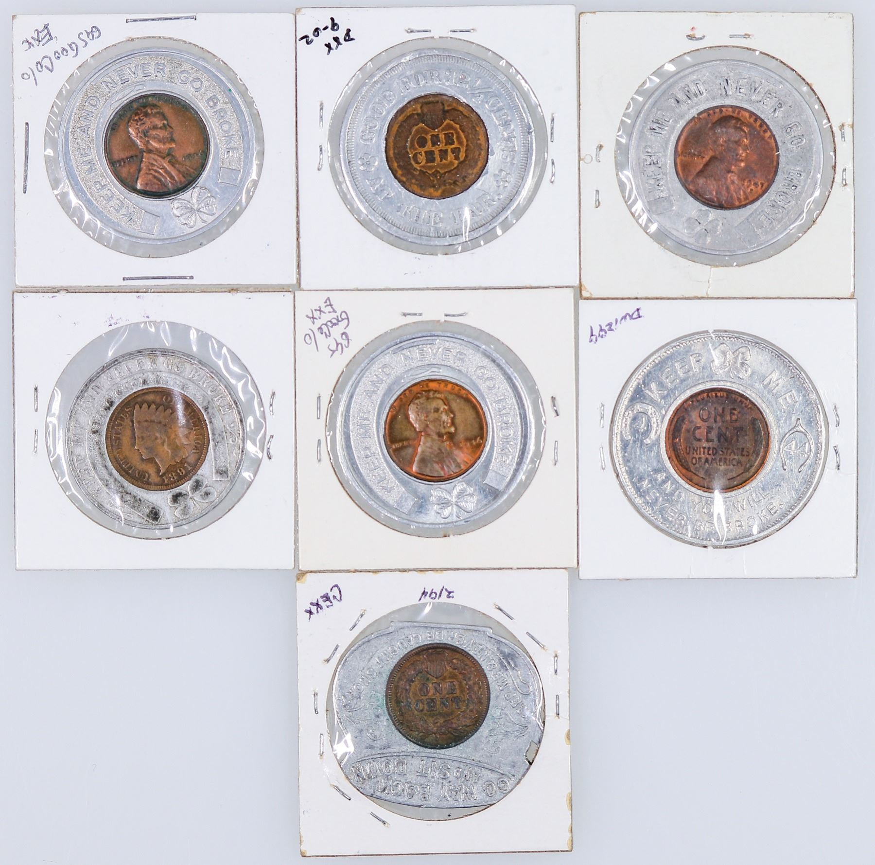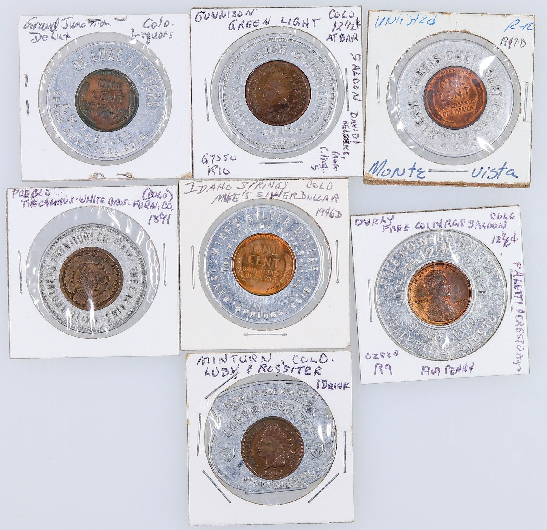 Lot of seven encased cents from various towns: 1) 1904 Indian Head: David & Helmick Green Light, Gunnison, Colo.; 2) 1907 Indian Head: Luby & Rossiter, Minturn; 3) 1891 Indian Head: The Calkins-White Brothers Furniture Co., Pueblo; 4) 1909 Lincoln: Free Coinage Saloon, Ouray; 5) 1946-D Lincoln: Mike's Silver Dollar, Idaho Springs; 6) 1946 Lincoln: Deluxe Liquors, Grand Junction; 7) 1947-D Lincoln: Glenn Curtis Chevrolet, Monte Vista.