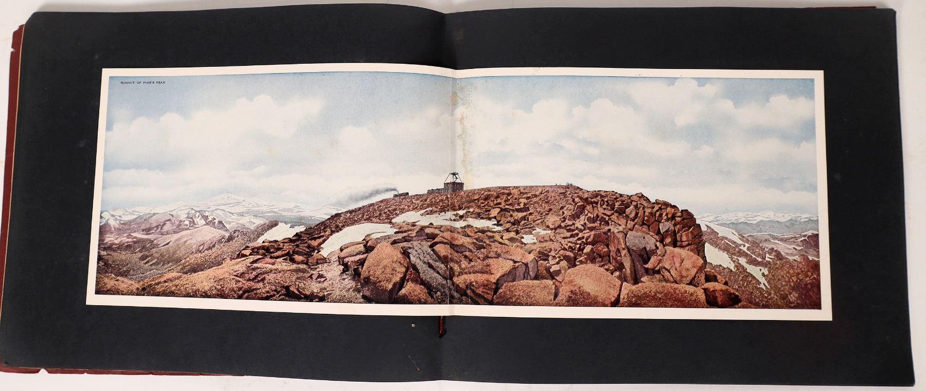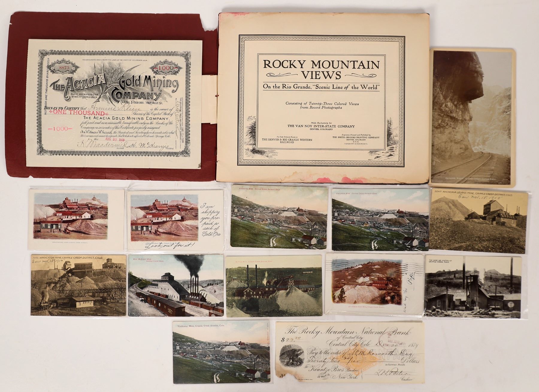 Colorado ephemera with 11 postcards, Hanging Rock 7.75x8.5" photo, 1909 Acacia Gold Mining stock, 1879 Rocky Mountain National Bank-lower left issue, Rocky Mountain Views, 1917 with 23 color views. Colorado