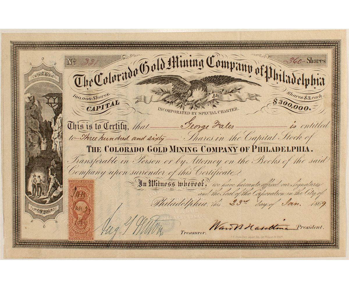 Territorial. The company had 300 feet east of the Clark-Gardner, one shaft 250 feet deep, one 80 feet deep; a drift 220 feet from the surface, runs 25 feet from the surface, runs 25 feet either way, exposing a pay vein eighteen inches in width. On the mine was an engine house with a small engine for hoisting. They had a large stone mill in Nevada Gulch, 70 ft. By 70 ft., exclusive of the engine house 34 by 35, an assay office 20 feet square, and a recess on one side for a quartz room. The mill was intended for 50 stamps, 12 pans, and two Cornish buddles. The company built a lean-to on the side of the mill 25 by 112, and a brick muffle 80 feet long, 6 by 9 feet in size, with a stack 50 feet high. The ore was introduced at one end, with one tenth of its weight of sodium sulfate, and worked to the other with shovels, then lixiviated for the copper and silver, and amalgamated for the gold. The mill was started 1 September 1886 [Ref: Hollister, The Mines of Colorado, p. 182, 1867]. Incorporated by special charter, with offices in Philadelphia. No. 331 issued to George Fales by Aug. G. [illegible], Treasurer, and Wm. B. Haseltine, President, for 360 shares on 23 January. A R 44 red, adhesive, certificate stamp, hand cancelled and perf.City: Central CityCounty: GilpinState: CODate: 1869
