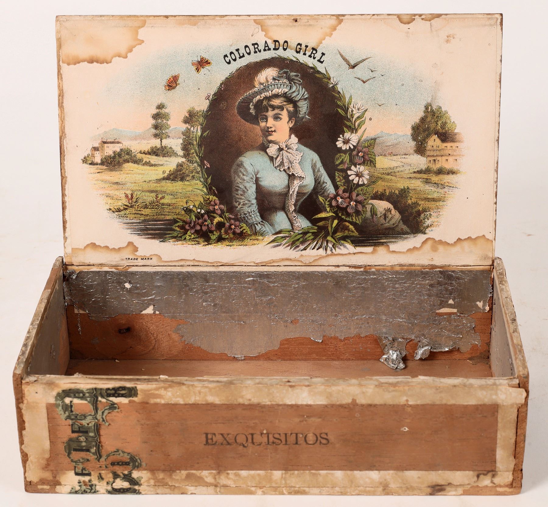 Gary Bracken's prized cigar box: Colorado Girl, Exquisitos, made at factory No. 26, 3rd District, New York. Partial revenue stamp, merchant D. H. Salinger & Co. Atchison, Kan. Lovely portrait of the Colorado Girl on the inside of the detached lid.