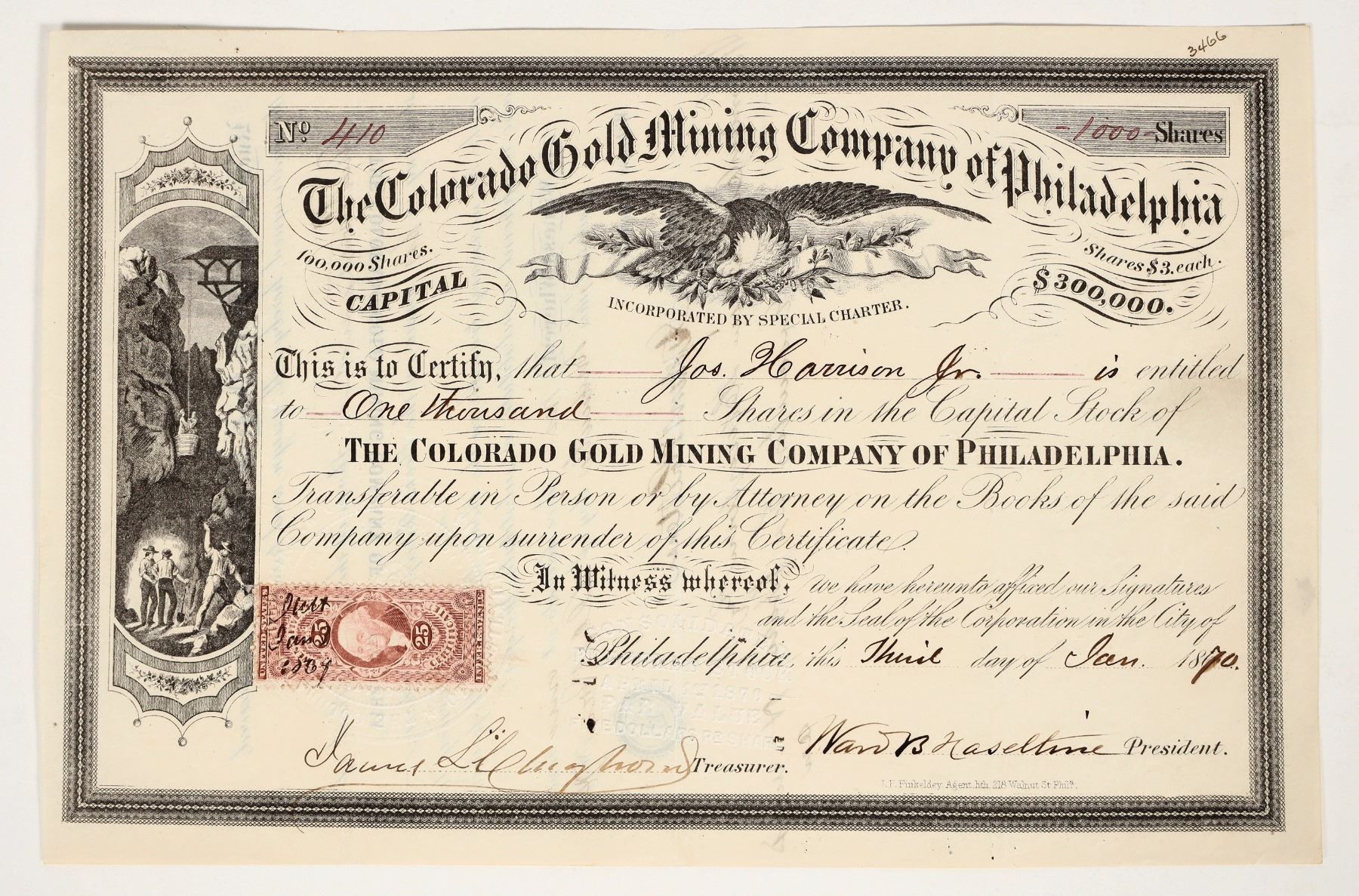 No. 410, issued for 1,000 shares to Jos. Harrison Jr. in 1870. Signed by president Haseltine and the treasurer. Not cancelled. Black border and print, nice mine hoisting vignette at left and eagle at top center. Folds, pinholes. 7 x 10.5" The company had 300 feet east of the Clark-Gardner, one shaft 250 feet deep, one 80 feet deep; a drift 220 feet from the surface, runs 25 feet from the surface, runs 25 feet either way, exposing a pay vein eighteen inches in width. On the mine was an engine house with a small engine for hoisting. They had a large stone mill in Nevada Gulch, 70 ft. By 70 ft., exclusive of the engine house 34 by 35, an assay office 20 feet square, and a recess on one side for a quartz room. The mill was intended for 50 stamps, 12 pans, and two Cornish buddles. The company built a lean-to on the side of the mill 25 by 112, and a brick muffle 80 feet long, 6 by 9 feet in size, with a stack 50 feet high. The ore was introduced at one end, with one tenth of its weight of sodium sulfate, and worked to the other with shovels, then lixiviated for the copper and silver, and amalgamated for the gold. The mill was started 1 September 1886 [Ref: Hollister, The Mines of Colorado, p. 182, 1867]. Incorporated by special charter, with offices in Philadelphia.