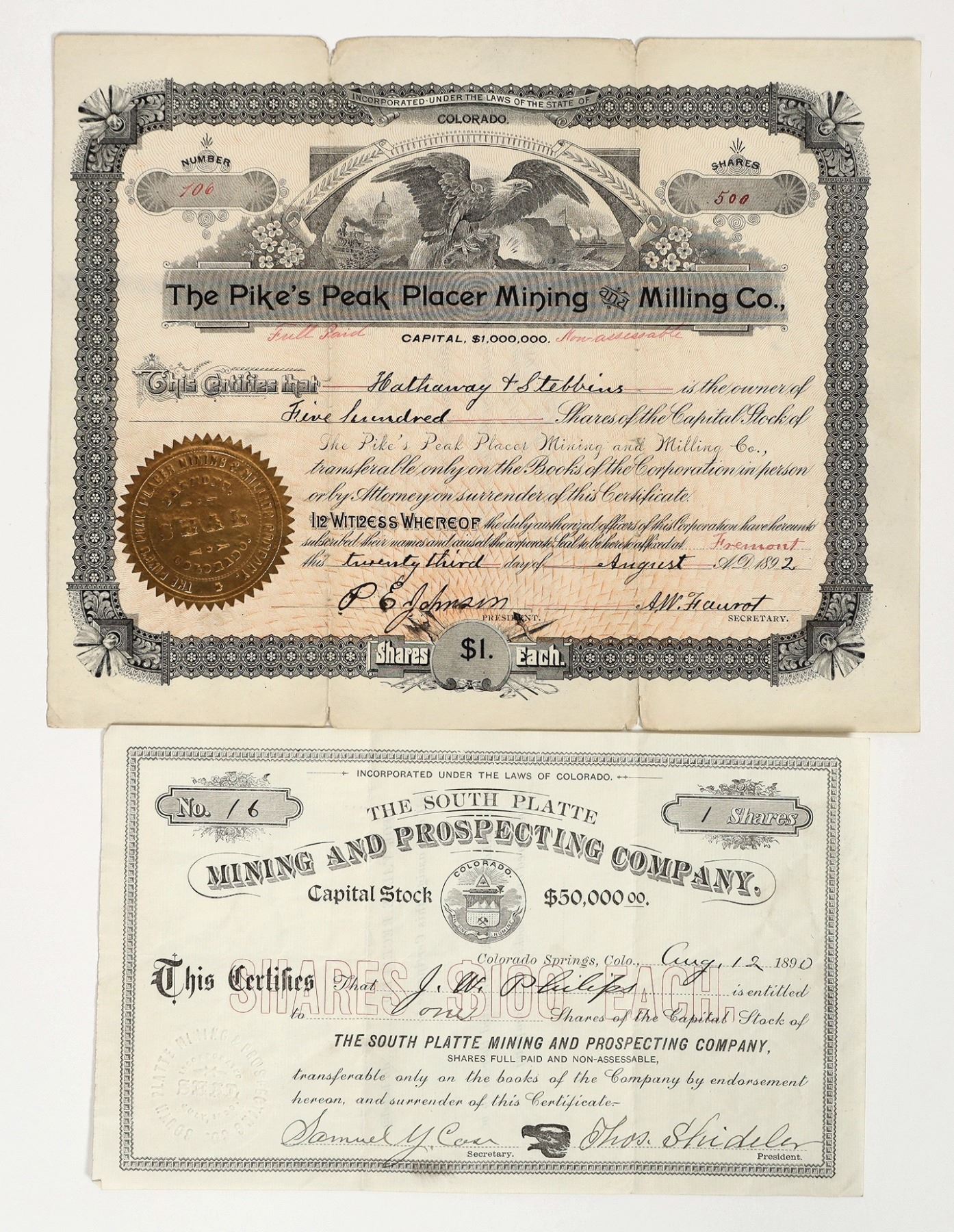Lot of 2 different. 1) The South Platte Mining and Prospecting Company. Inc. in Colorado. No. 16, issued for 1 share to JW Philips in 1890. Signed by president Thos. Shideler and secretary Samuel Cox. Not cancelled. Folds. Not in C&L. No references found on newspapers.com. 2) The Pike's Peak Placer Mining & Milling Co. No. 106, issued for 500 shares in 1892 in Fremont. Signed by president PE Johnson and the secretary. Not cancelled. Folds with separation. Mineral Hill in the Cripple Creek District, Teller Co., Colorado.
