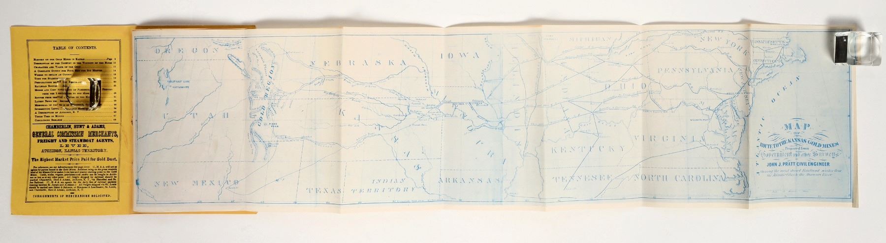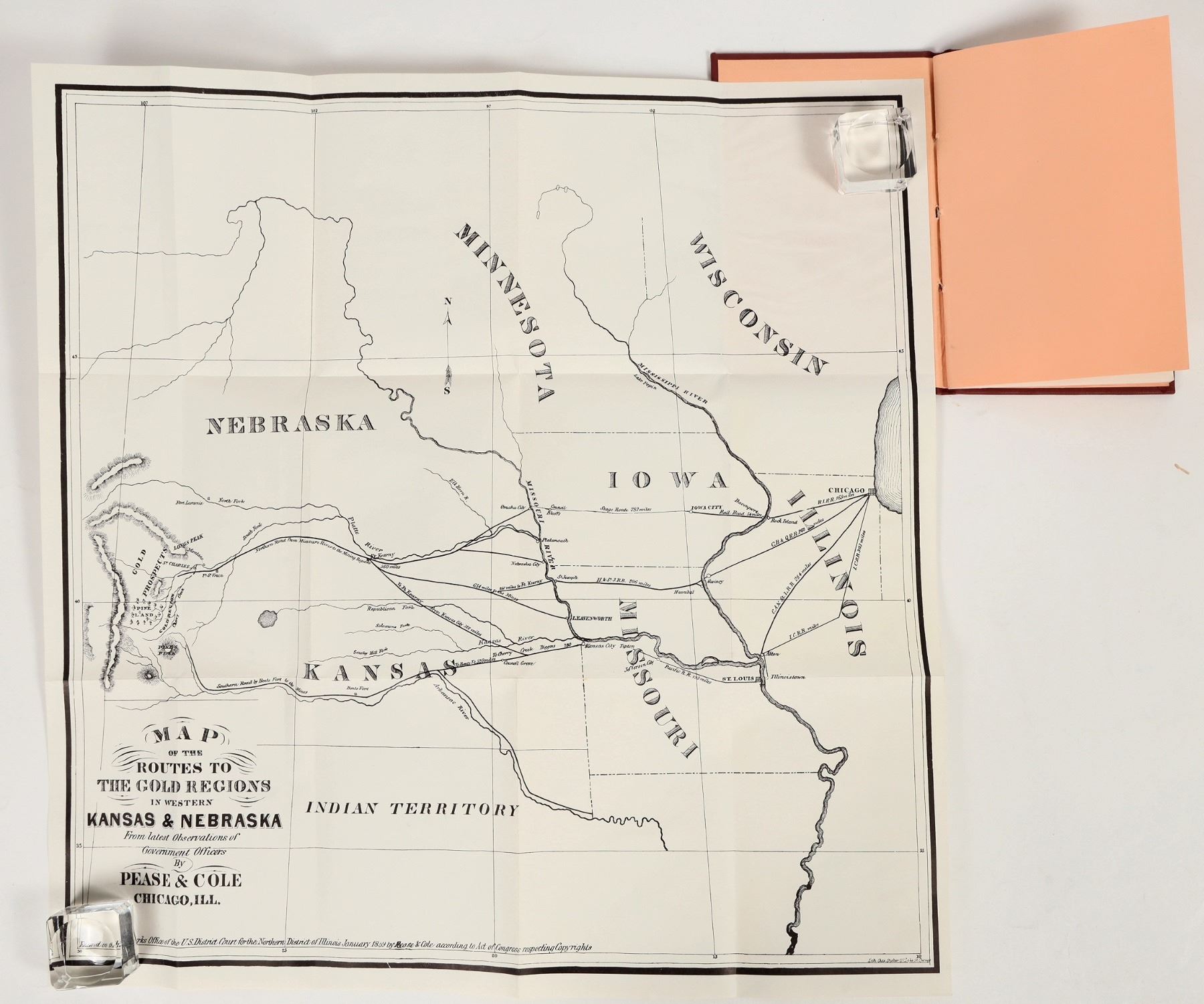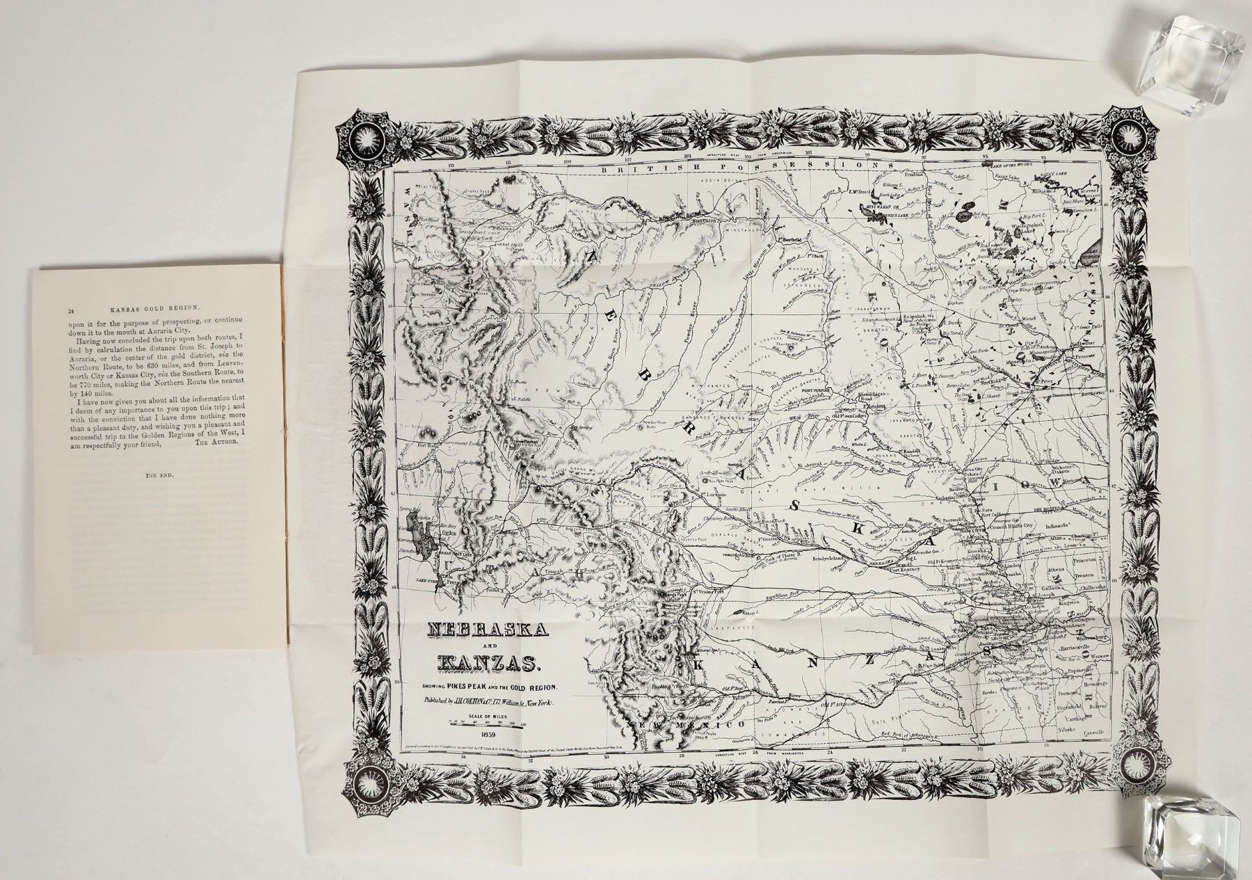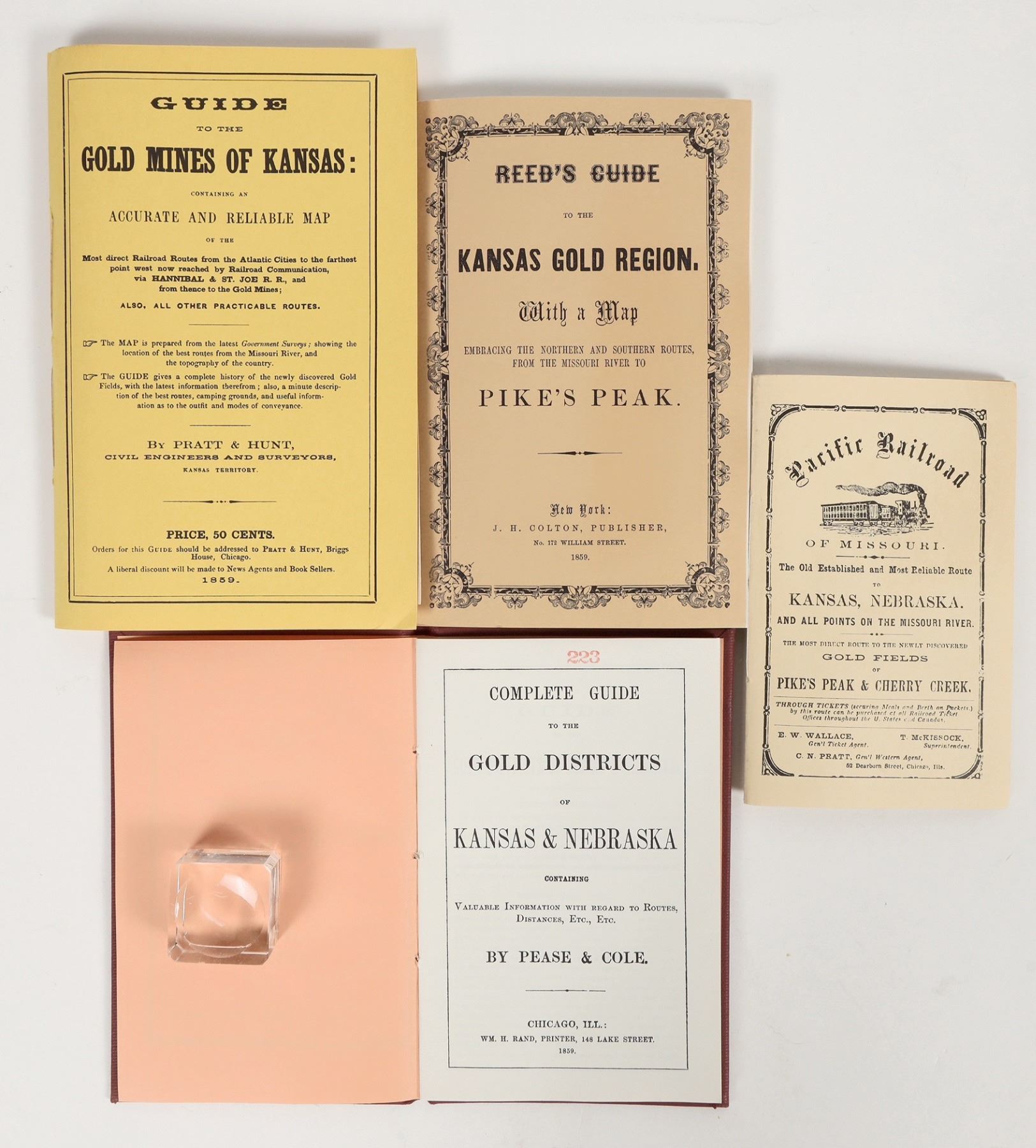 Gold rush pioneer's guidebooks for traveling, including a packing list, terrain descriptions, game of the area, distances from camp to camp, general travel advice and more. Includes paper-cover guides to the Kansas Gold Region (travel), Gold Mines of Kansas, Pacific Railroad travel routes to Kansas/Nebraska, and a hardcover Gold Field fold-out map measuring 17x18" in b/w. Booklets are approximately 5x7" or smaller, with 17x14.5" or narrower dimension fold-out maps glued to the covers of the paperback books. Come in 4 cardboard boxes lined with woodgrain pattern paper, 6x9x1.25" (about the size of a VHS cover). Labels do not match contents. Booklets/maps in good condition. Woodgrain paper is peeling at edges/corners. See photo.