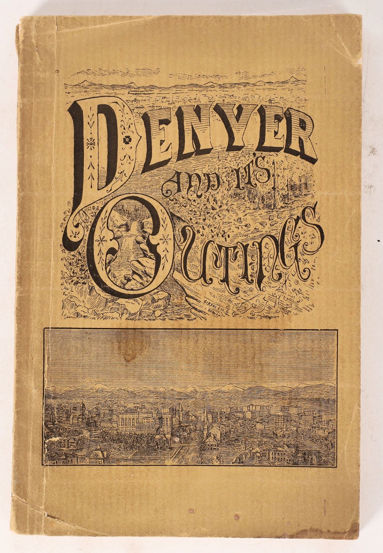 Very rare 1892 Colorado Hand-Book, Denver & it's Outings by W G M Stone with foldout map. Tourist info, early history & general information. 170pp with index & advertisements. Detaching covers, cover has 2 inner upper corner tape repairs, lower right cover stain, 2.25" lower left front cover tear. Please inspect. [Denver Colorado