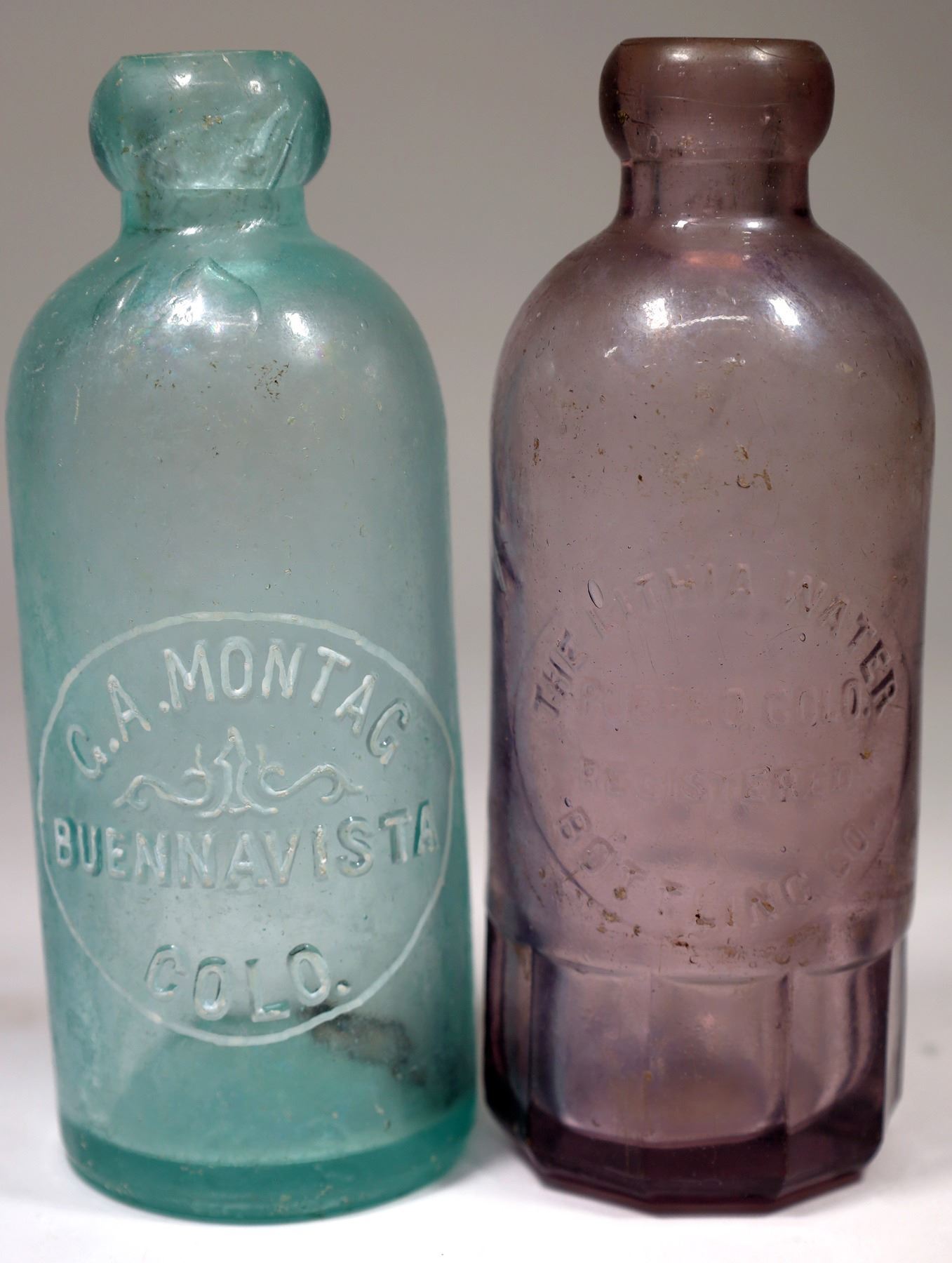 Aqua G. A. Montag/Buennavista/Colo. Several small dings. The Lithia Water/Pueblo, Colo./Registered/Bottling Co. Several dings and 1 small chip.