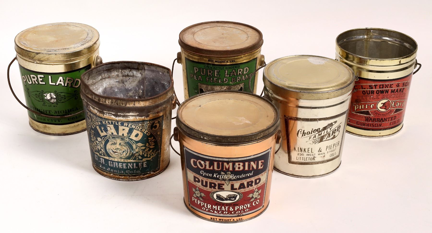 6 Colorado lard tins. All about 6x6". Columbine, Denver. San Luis Baking, Alamosa. CL Stone & Son, Gunnison. CR Greenlee, La Junta. Kinkel & Pieper, Littleton. Wright-Morgan, Canon City. 4 and 5 pound tins.