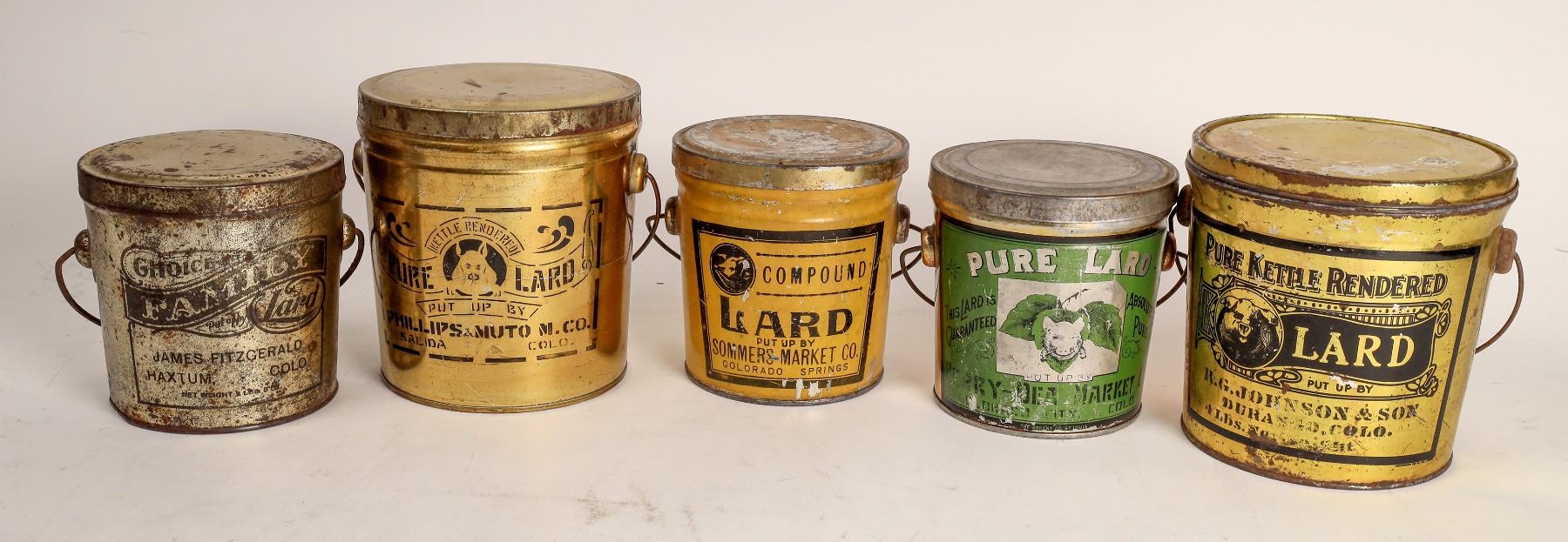 5 Colorado lard tins from different towns, c. 1895-1910. R G Johnson, Durango, with black logo and lid, 6x6", some rust. James Fitzgerald, Haxtum, 5x4.75" with lid and black logo, some rust. Sommers Market, Colorado Springs, yellow with lid, 5.25x5", some wear. Perry-Dea Market, Colorado City, green logo with lid, 5.25x5", small dent over "PURE". Phillips & Muto, Salida, black logo with lid, 6.25x5.75", some lid rust. No significant dents in this group. A nice display set! Colorado Gary Bracken Collection