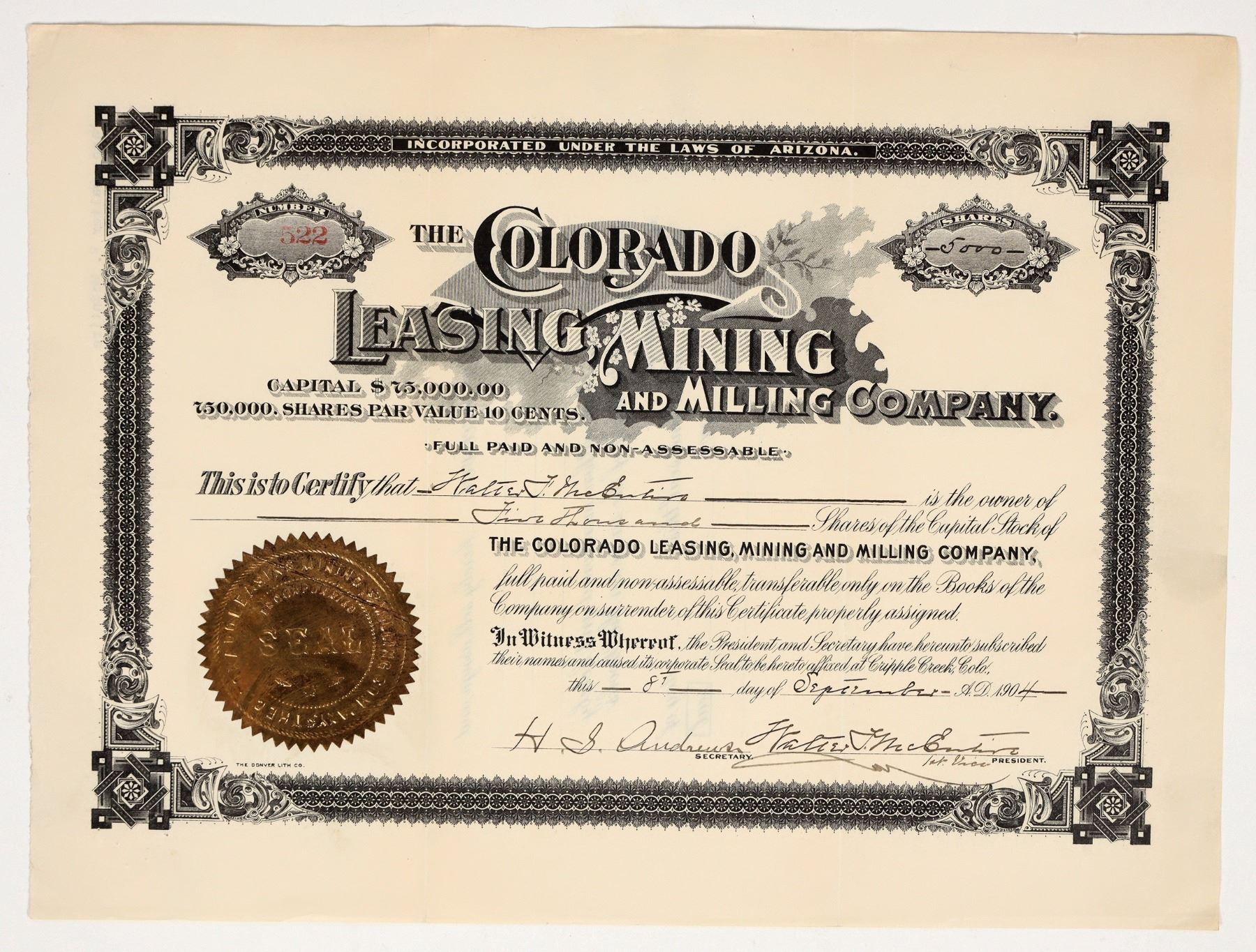 Rare. Inc. in Arizona. No. 522, issued for 5,000 shares to the vice president McEntire in 1904. Signed by McEntire and secretary Andrews. Not cancelled. Black border and print, gold seal. Folds, pinholes. 8.5 x 11.5" According to an article in The Sun (Dec. 22, 1902), this company owned the Dexter and Caledonia mines at Cripple Creek and they have struck a 3.5 foot vein.