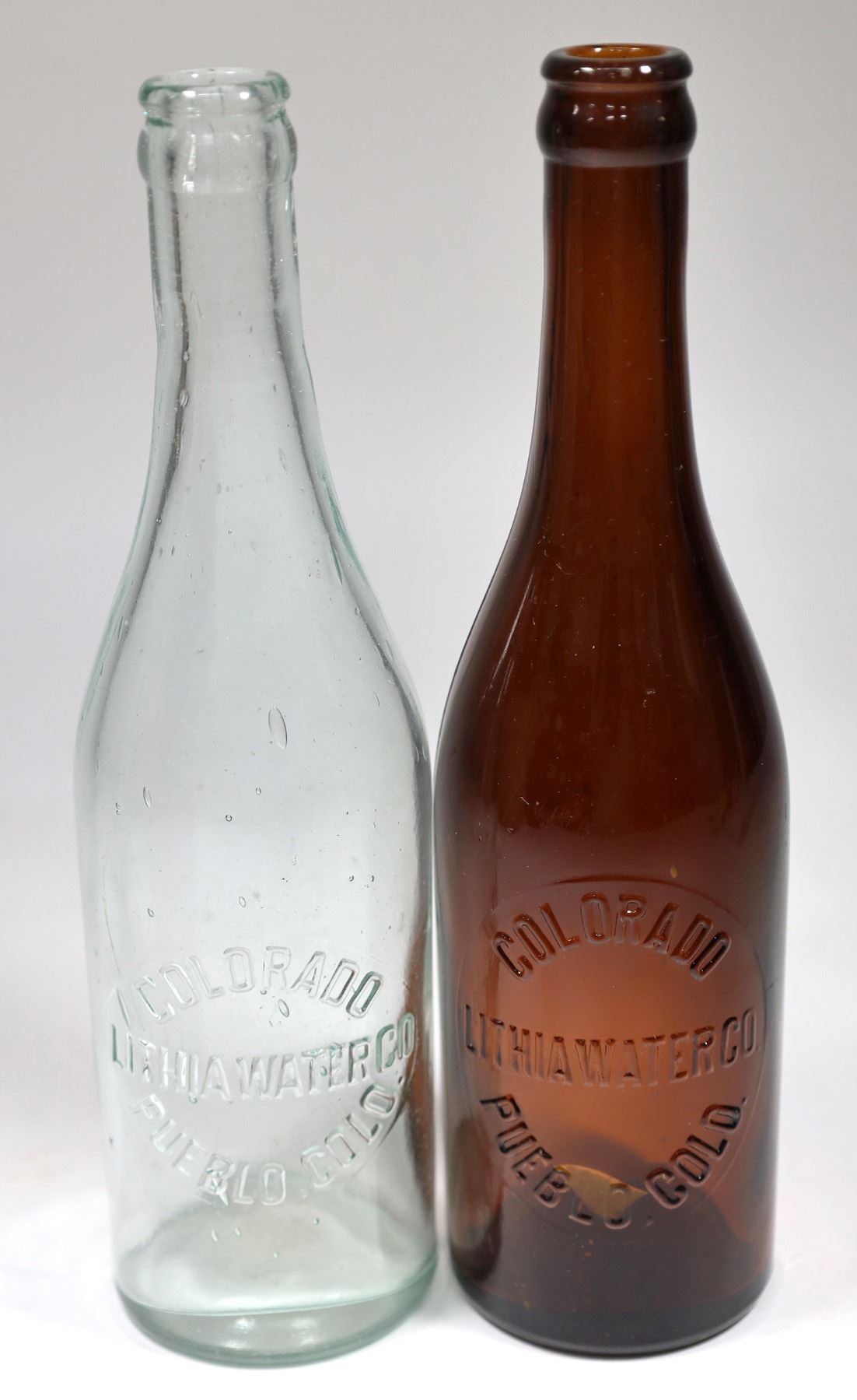 Light aqua and dark amber crown tops. Colorado/Lithia Water Co/Pueblo, Colo. Amber has small lip ding. No apparent chips or dings.