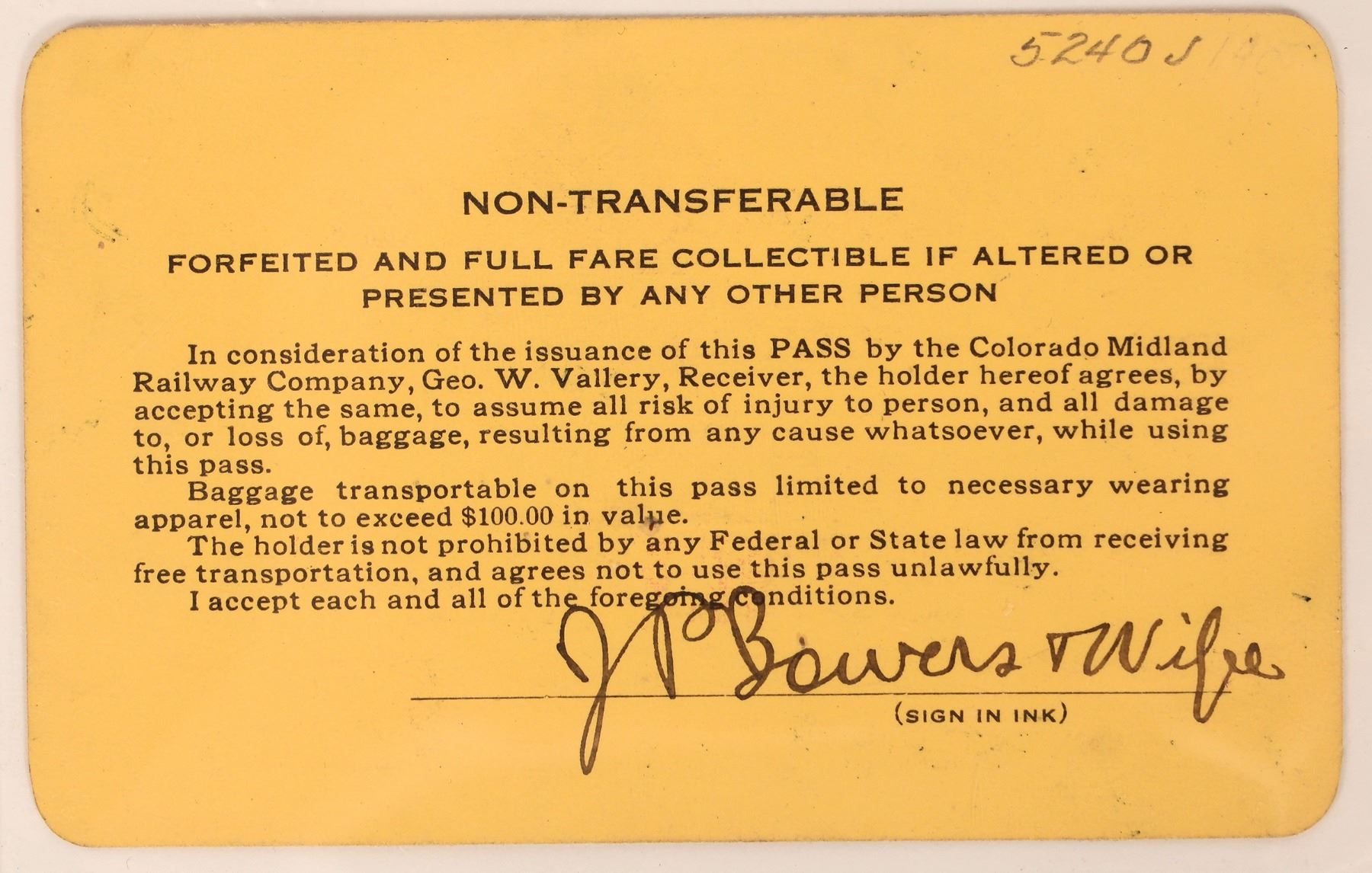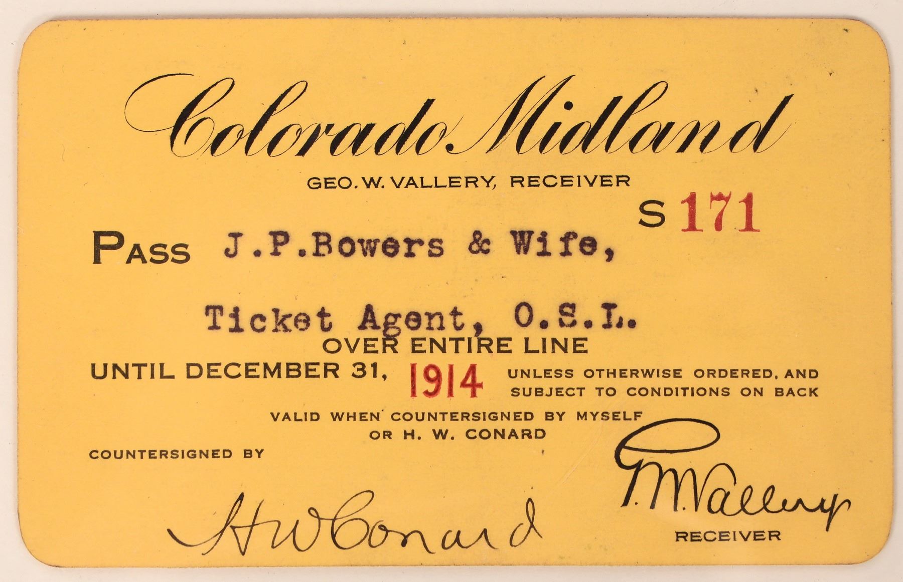 #S171 issued 1914 to J P Bowers, Over Entire Line, OSL, signed G W Vallery receiver, yellow card stock, unk printer. [Ron Lerch Collection] [