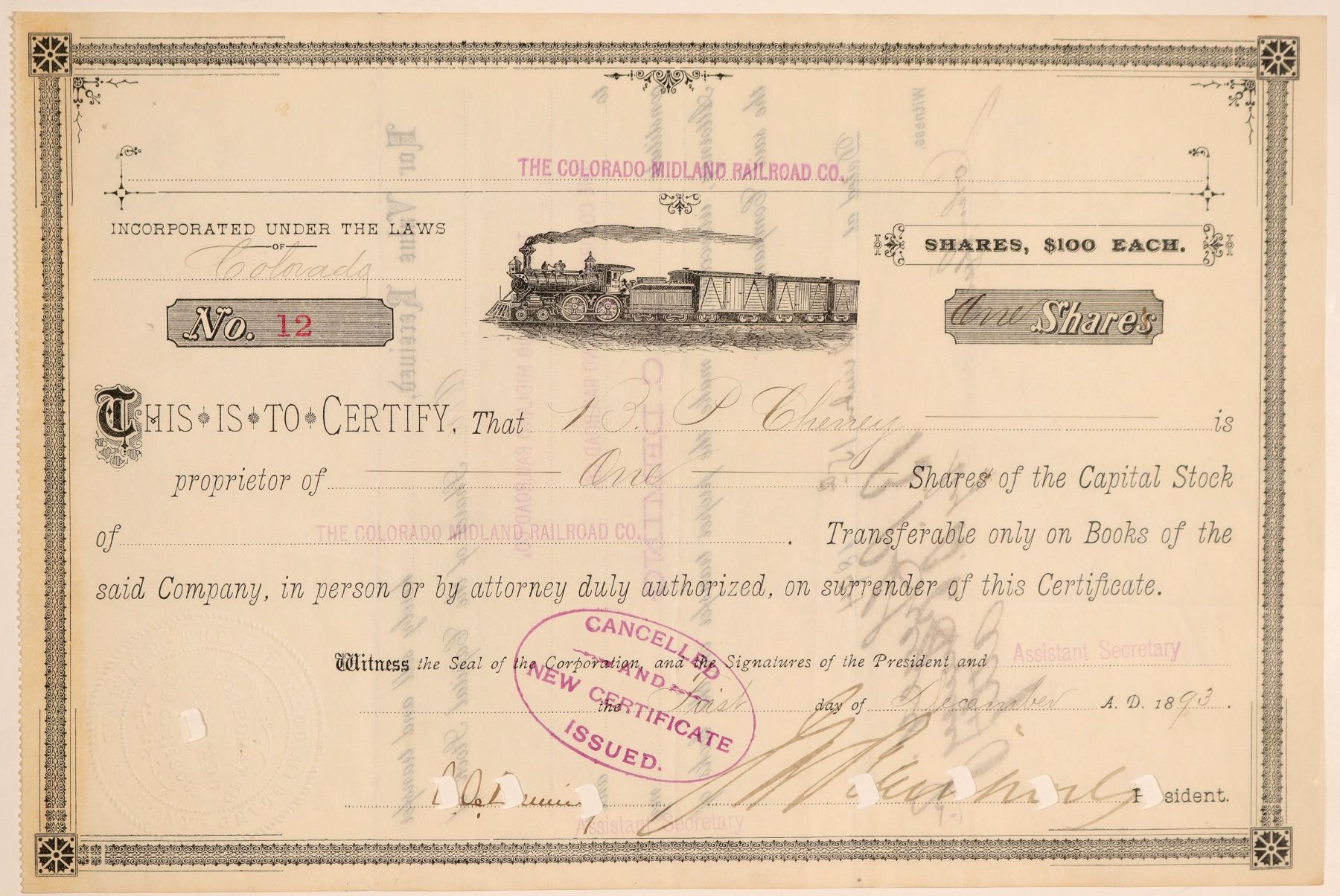 Stock Certificate from the Colorado Midland Railroad Co. Certificate number 12 issued in 1893 at Colorado to B.P. Cheney. Signatures hole punched. Size 10 by 6.5 inches. Cancelled. Stamped, "Cancelled and New Certificate Issued." Incorporated in 1883. This was the first standard gauge railroad built over the Continental Divide in Colorado. It ran from Colorado Springs to Leadville and through the divide at Hagerman Pass to Glenwood Springs and Grand Junction.