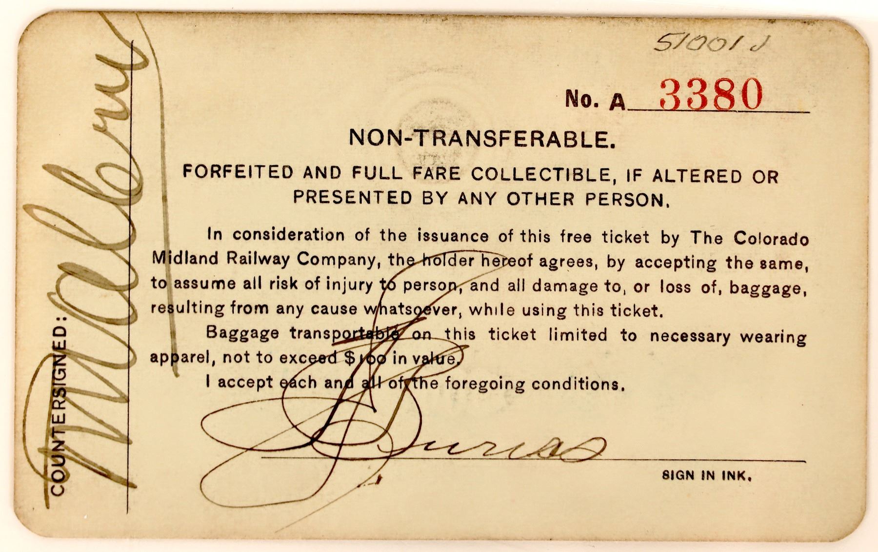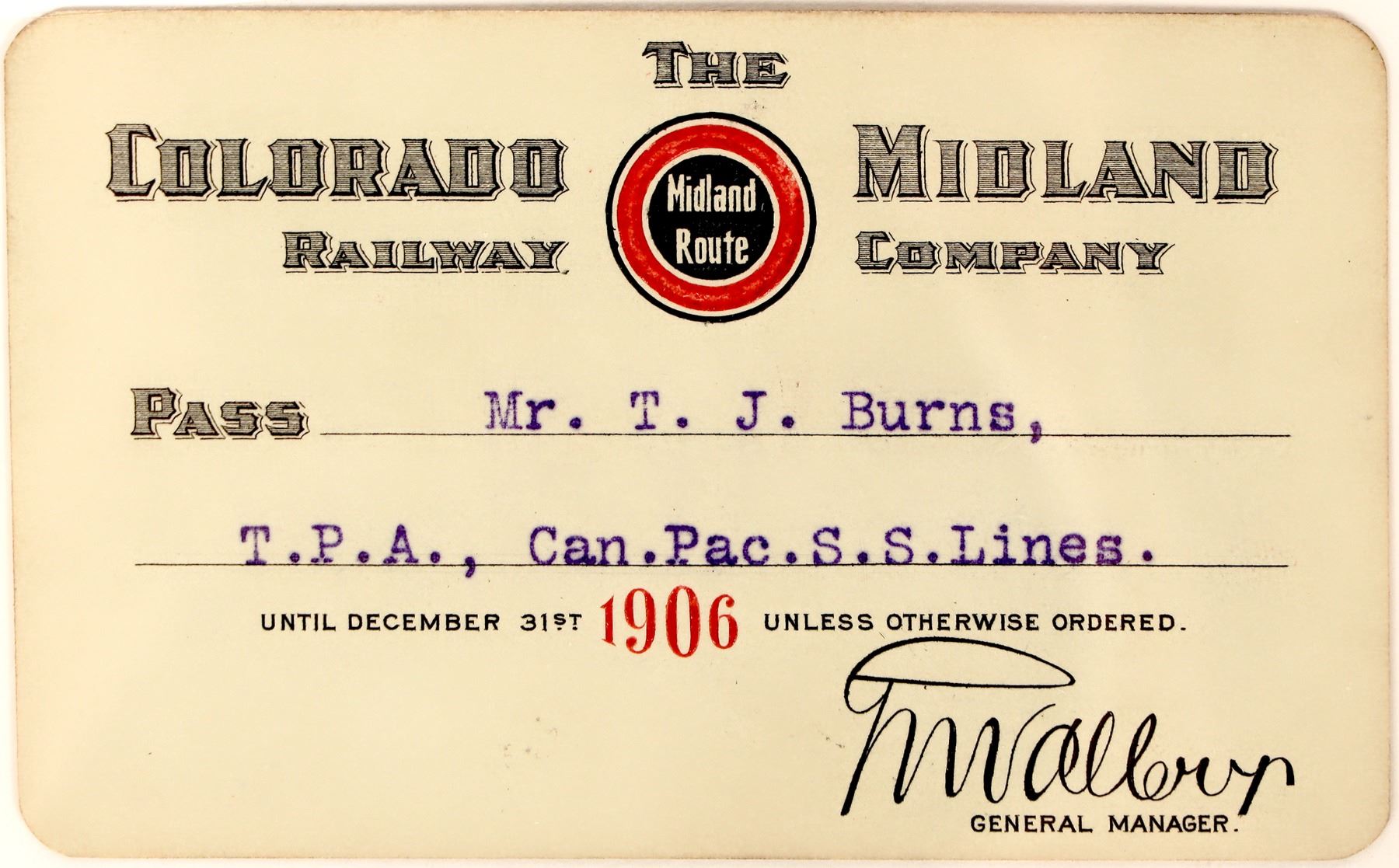 #A3380 issued 1906 to T J Burns, CP SS Lines, signed H W Vallery GM, green card stock, company embossed logo center of title "Midland Route", unk printer. Inc. in 1883. It ran from Colorado Springs to Leadville and through the divide at Hagerman Pass to Glenwood Springs and Grand Junction.